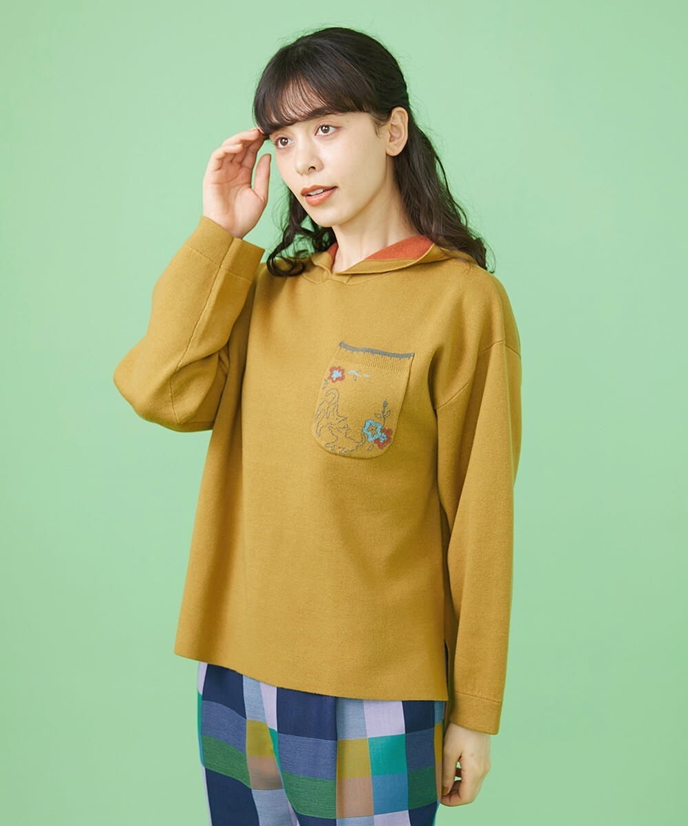 ドロップショルダーでゆったりと快適な着心地のシルエット。後ろの着丈が長く前後差のあるデザインです。ポケット部分には猫と犬がジャカードで施されており、ホコモモラらしい遊び心が詰まったこだわりのポイントに。