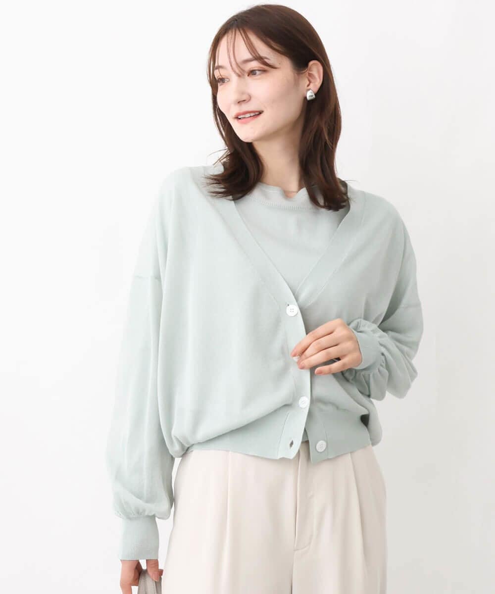 長すぎない程よい腰丈のカーディガンとクルーネックの半袖ニットは、単品でも汎用性抜群。