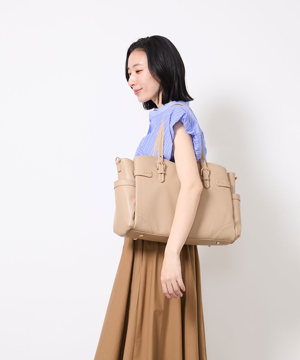 メタルアクセントがおしゃれなビックトートバッグです。デイリーもビジネスシーンもお使いしやすいデザインとカラーリングで、幅広いシーンで活躍します。