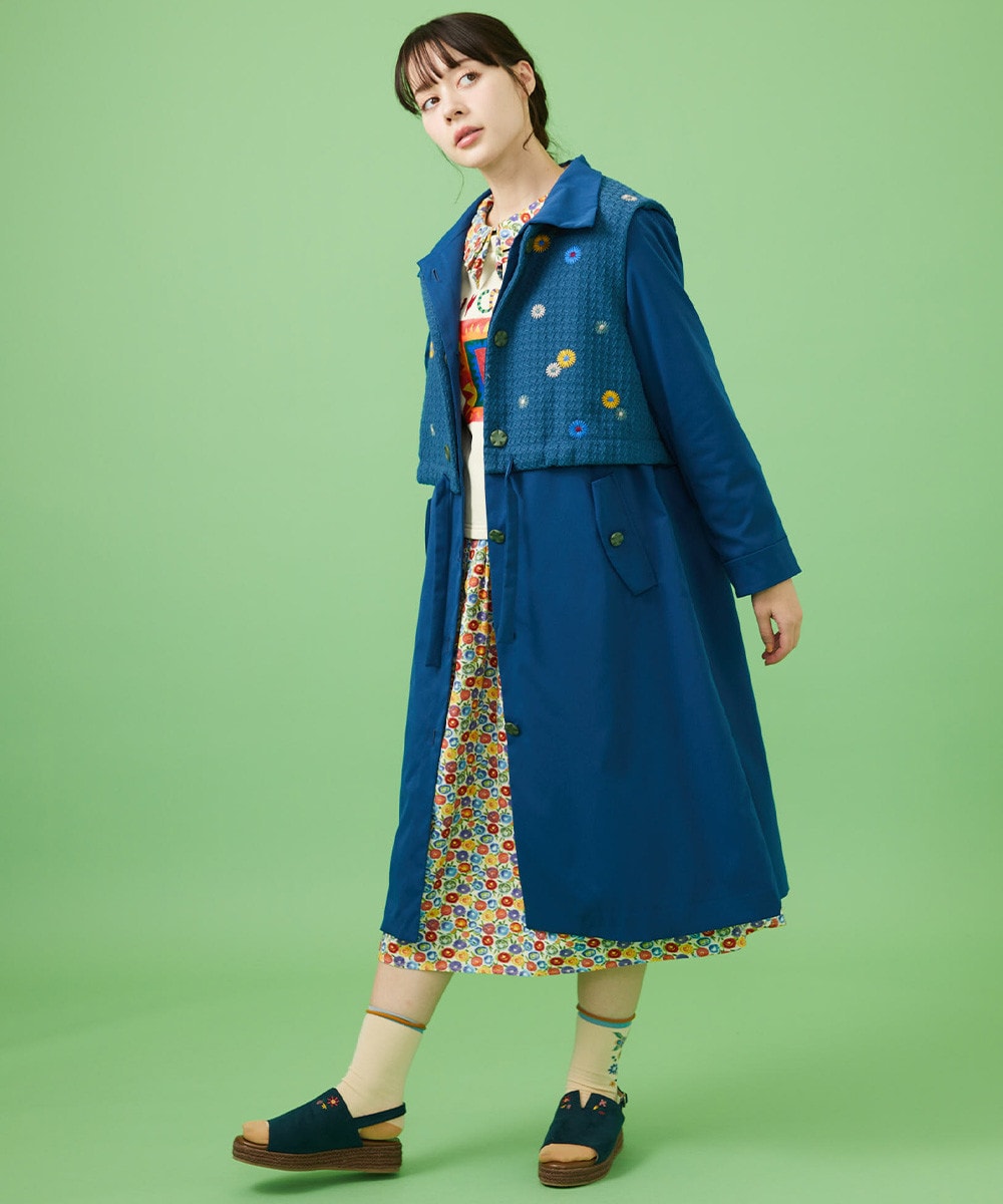 シンプルなロングコートに、取り外し可能なベストを組み合わせた異素材感が楽しい一枚。コートは柔らかなツイル素材、ベストにはざっくりとしたジャカードを使用し、上からフラワー刺繍を施した大人かわいいアイテムです。コートの襟は開けたり、ボタンを閉めてスタンドネック風にもお召しいただけます。海のようなブルーが目を惹く今季イチオシのロングコートです。