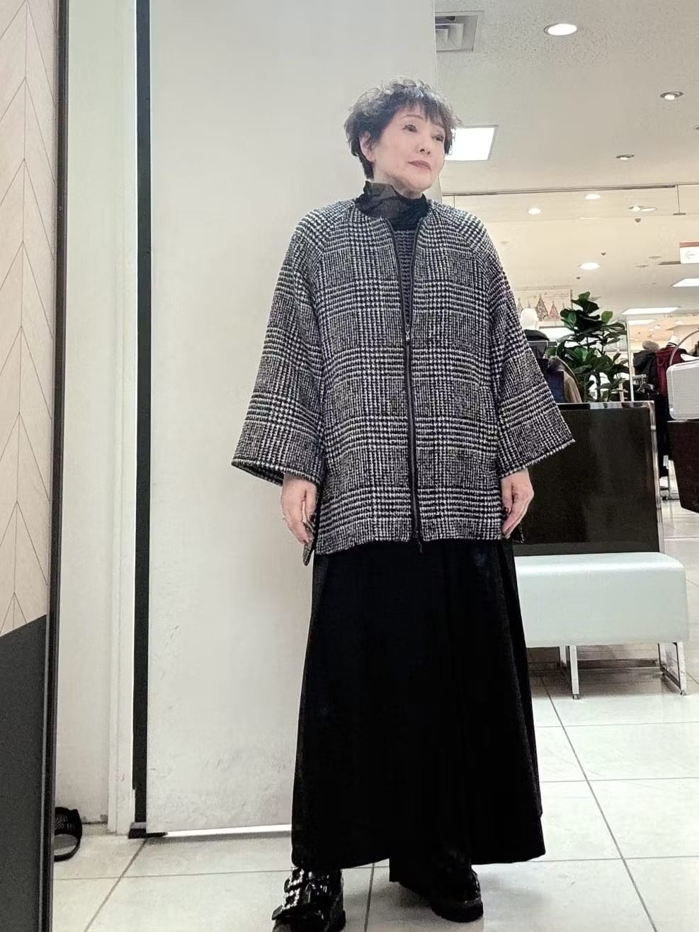ウール素材の柔らかなチェックアウターにレザースカートを合わせた大人のオフィスカジュアルコーデ。