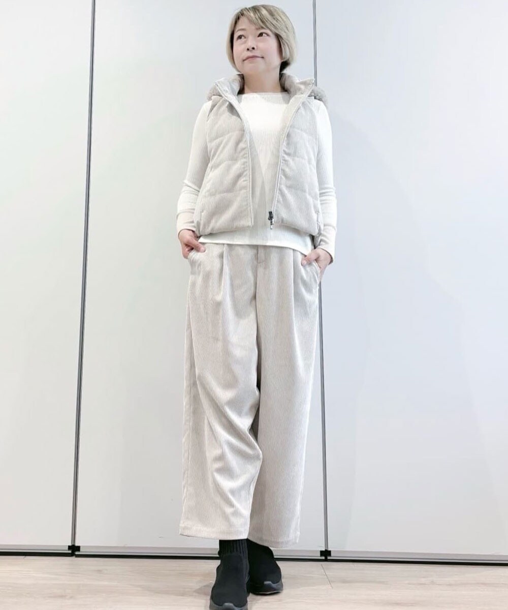 秋冬ならではの素材のコーデュロイのセットアップです。軽量で表面感のある凹凸が魅力でニットとの相性が良く、季節感を演出します。また、空気を蓄えることができるため、保湿性・吸湿性に優れています。毎シーズン人気のフードベストは屋内や車移動の時にも気にならない、コンパクトな丈感になっています。真冬はコートのライナーとしても活躍するので、ロングシーズンで活躍します。フードとファーが取り外し可能なのでその日の気分で変化を楽しめます。