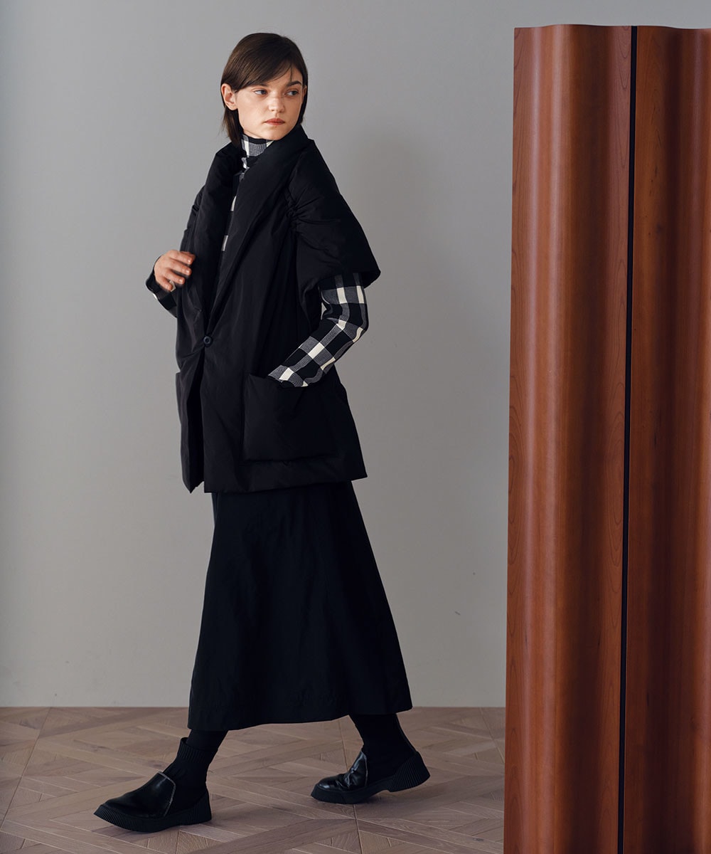大胆なチェック柄のニットプルオーバーと、 ポケットディテールが可愛いタフタニットジョイントのふんわりスカートに、ジレ風のパデットストールをオンして。