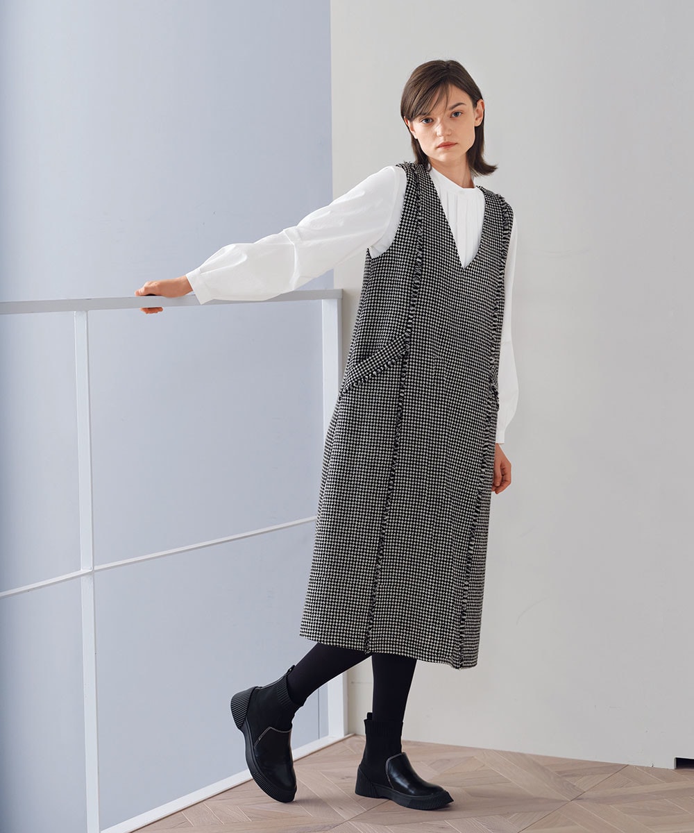 ハウンドトゥースツイードのジャンパースカートは、 フリンジが可愛いアクセント。