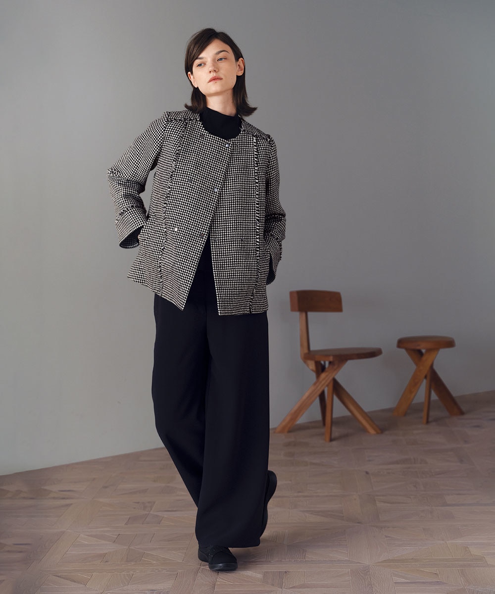 ボクシーなシルエットのノーカラージャケットに、 ワイドパンツを合わせてグッドルッキングなバランスに。