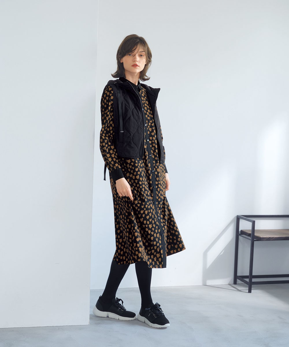 ハートをアレンジしたドット柄がチャーミングなシャツドレスは、 キャメル×ブラックの辛口配色で大人仕様に。
