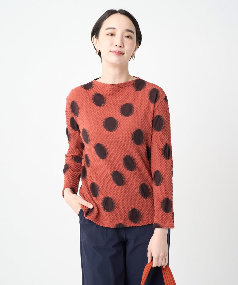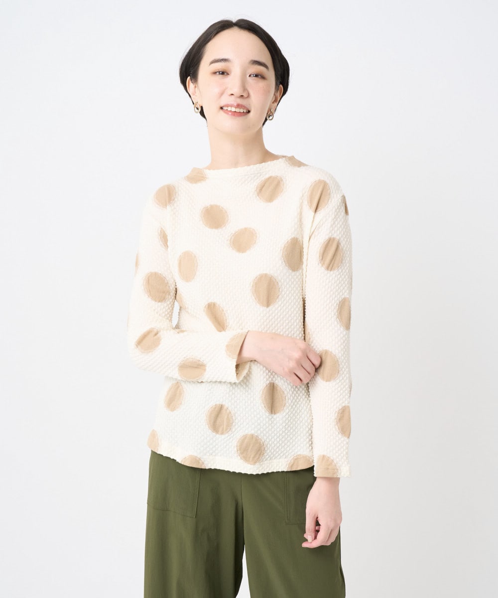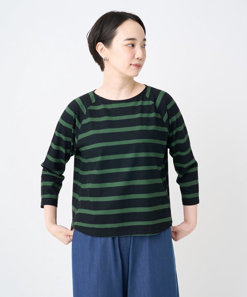 抜染プリントにてボーダーを表現しナチュラル感をプラス。シンプルながらに1枚でも着映えする上品ボーダー。裾裏の配色デザインもポイント。