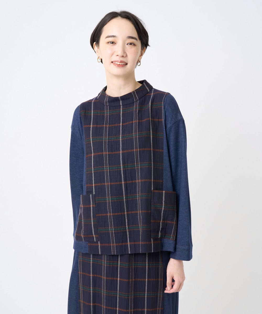 チェック柄のガーゼ調先染め二重織物生地が上品な逸品。袖と脇身頃には配色感を生かした着心地の良いリバージャージーを異素材使いで軽やかな印象に。