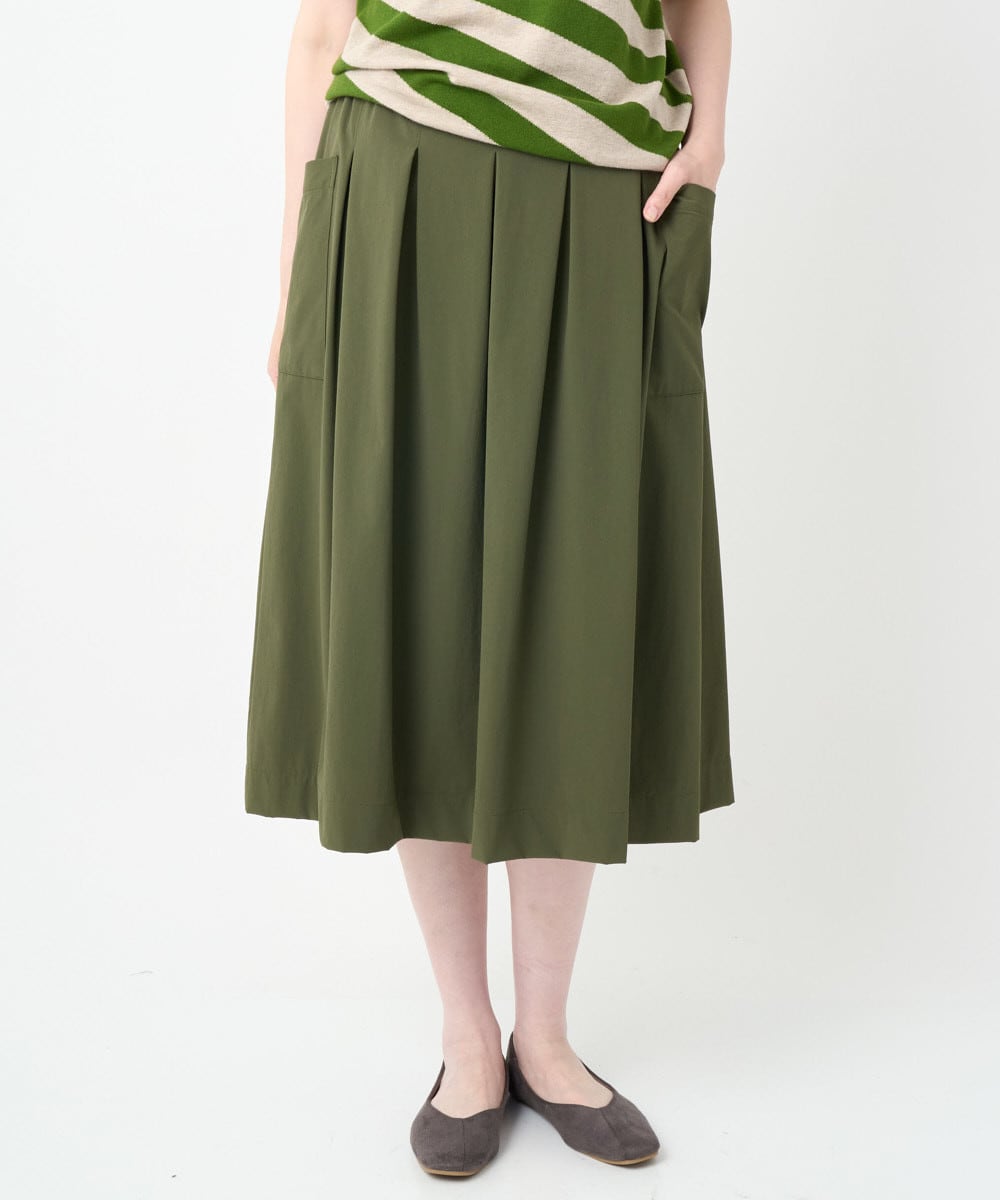 ジャンニロ定番、アウトポケットがポイントのタックギャザースカート。タテ・ヨコ・ナナメに伸縮性が優れた薄手平織素材で、ハリコシがあり、ドライでマットな質感。