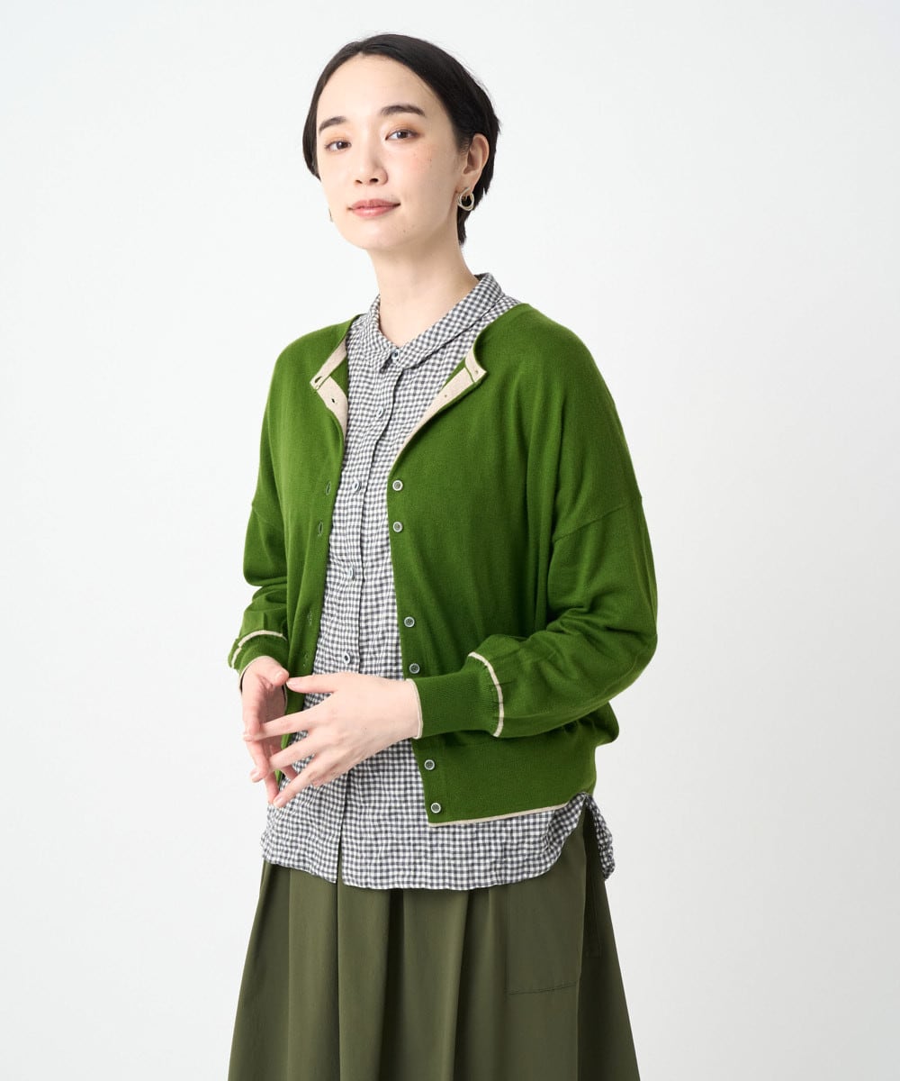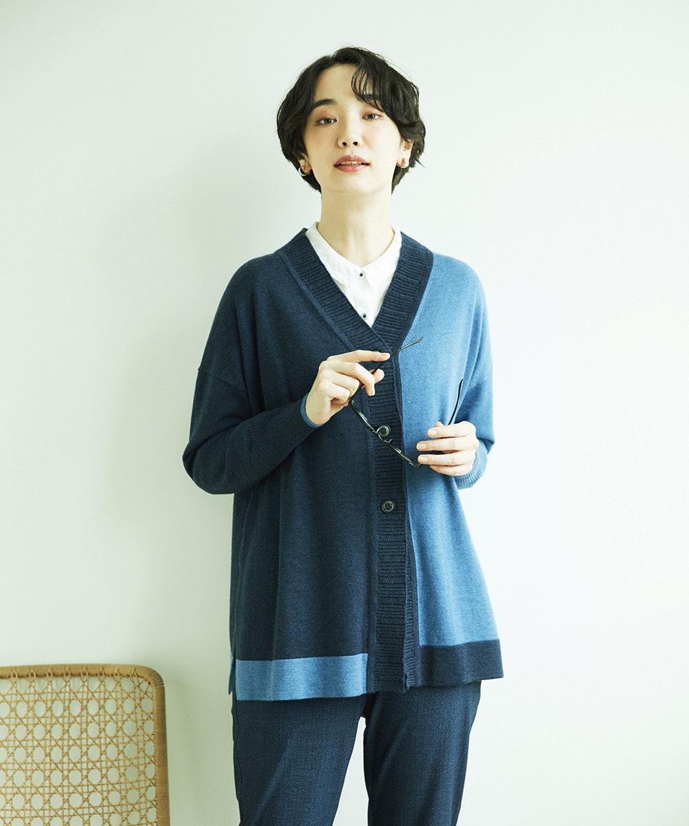 ゆったりしたリラックス感のある、ハイゲージ編みのニットカーディガン。サッと羽織るだけで様になるバイカラーデザイン。