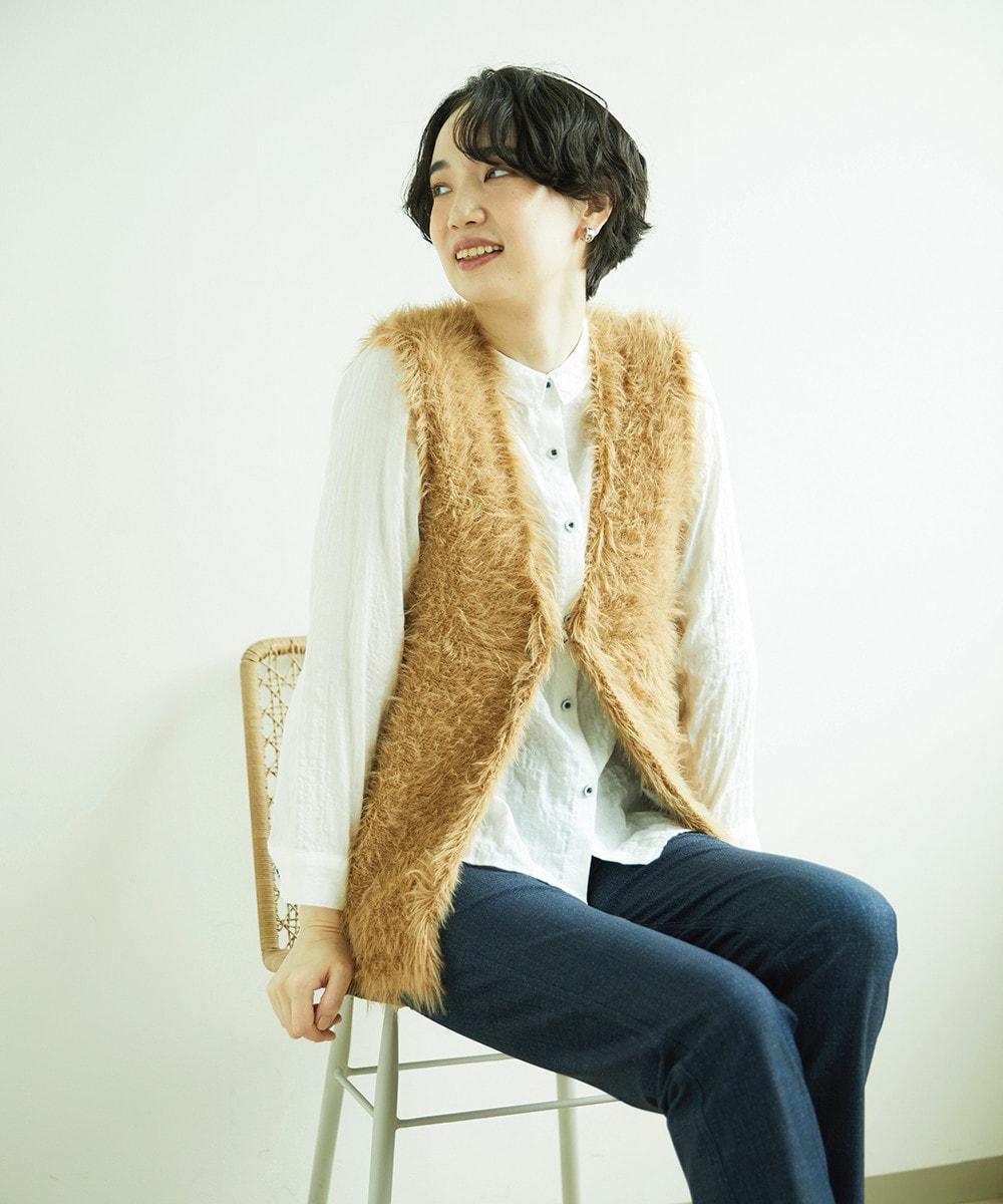 秋冬のトレンドであるファーベストニット。ボリューム感を抑え、コートインでもすっきりとレイヤードが決まるアイテム。