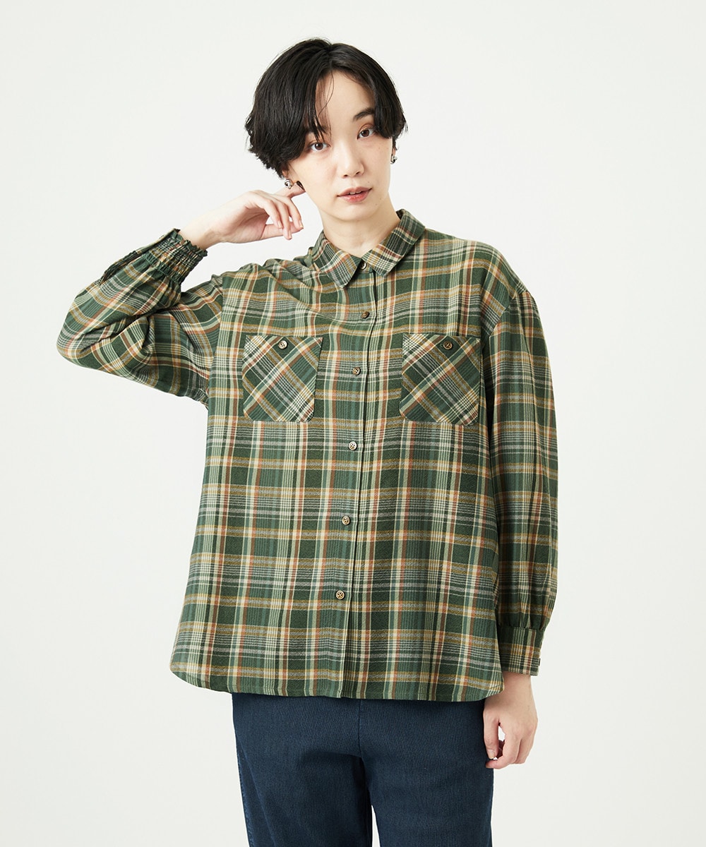 先染めならではの深みのあるチェックをオリジナルで織り上げたブラウス。程よい丈感は、どんなボトムとも合わせやすく、羽織りとしても使いやすい。