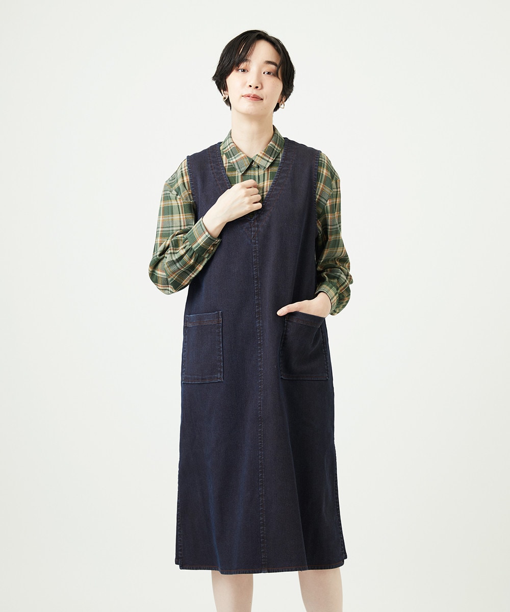 インディコ素材を使用した、Vネックできれいな縦ラインのジャンバースカート。甘すぎない大人の女性らしい装いが完成。