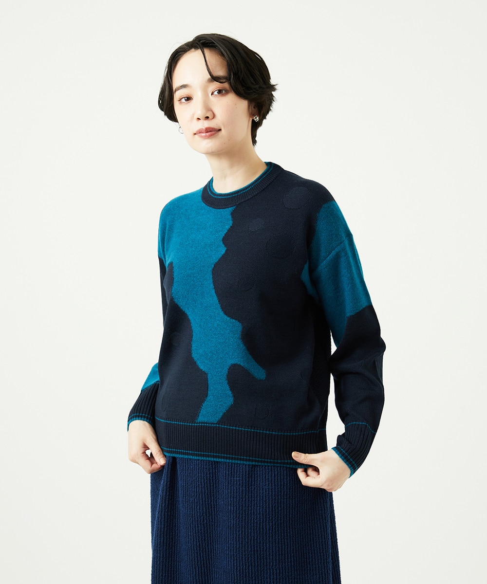 上質ながらカジュアルに使用できるニット。イタリア半島の柄がおしゃれ見えする楽しいデザイン。