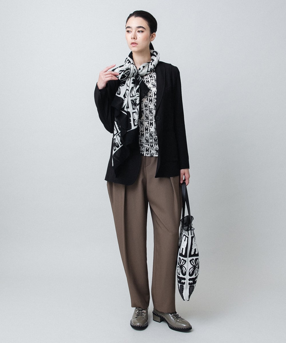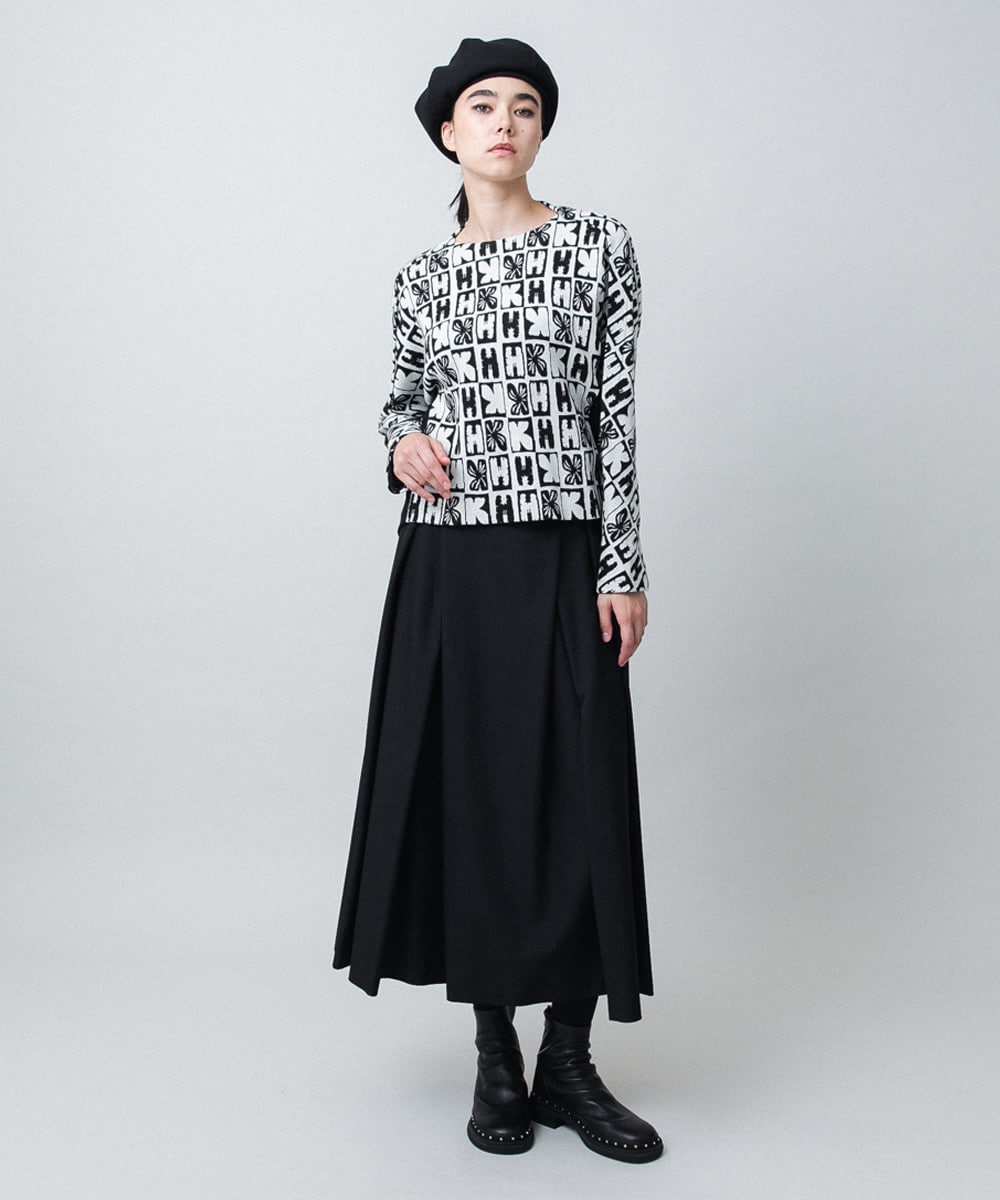 HKイニシャルロゴ&フラワーのモノトーンプリントがモードな雰囲気を纏う一枚。