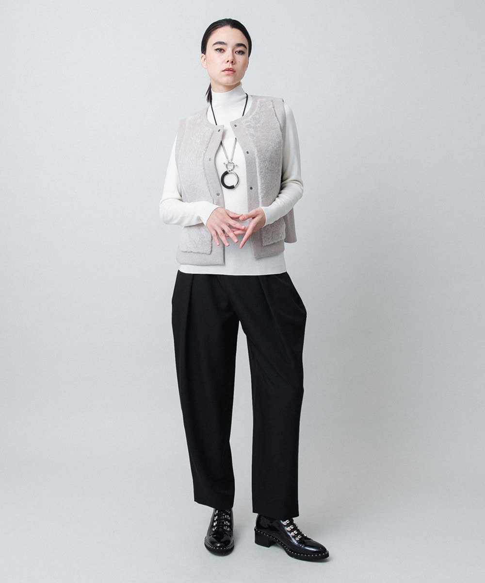 ウエストのニットリブとお揃いのトップスを合わせ、リンクコーデにすることで統一感とデザインの美しさを際立たせます。