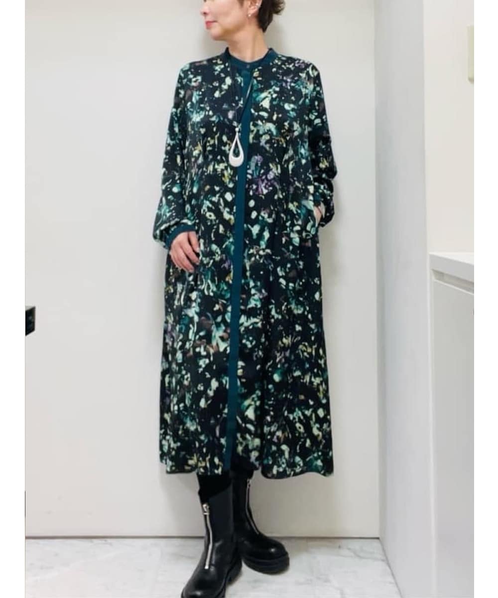 シンプルながら洗練された大人カジュアルを叶えるリーフプリントバンドカラーワンピースは、深みのあるグリーンカラーとアーティスティックなプリント柄が秋の装いにぴったり。