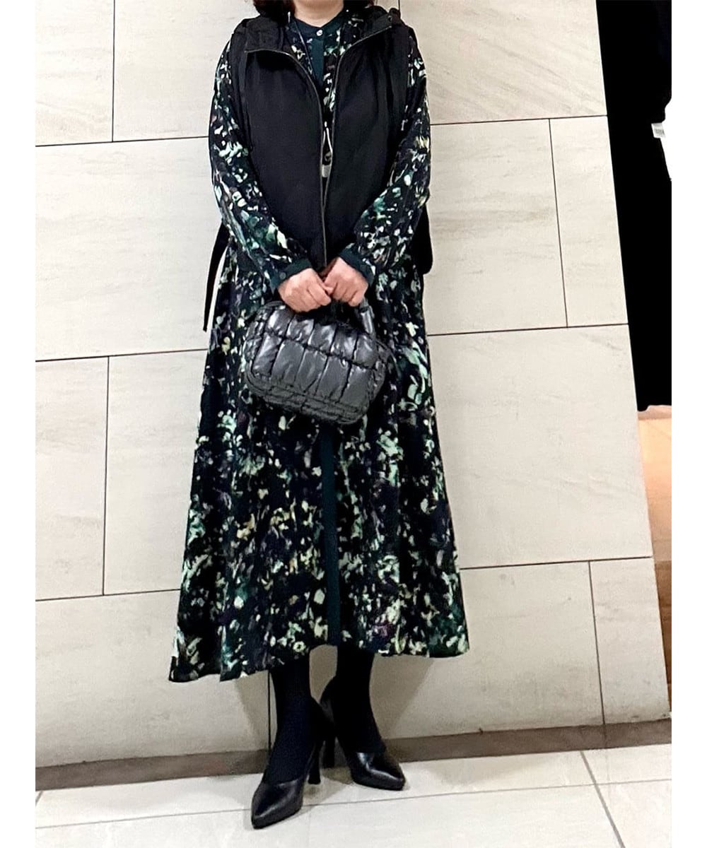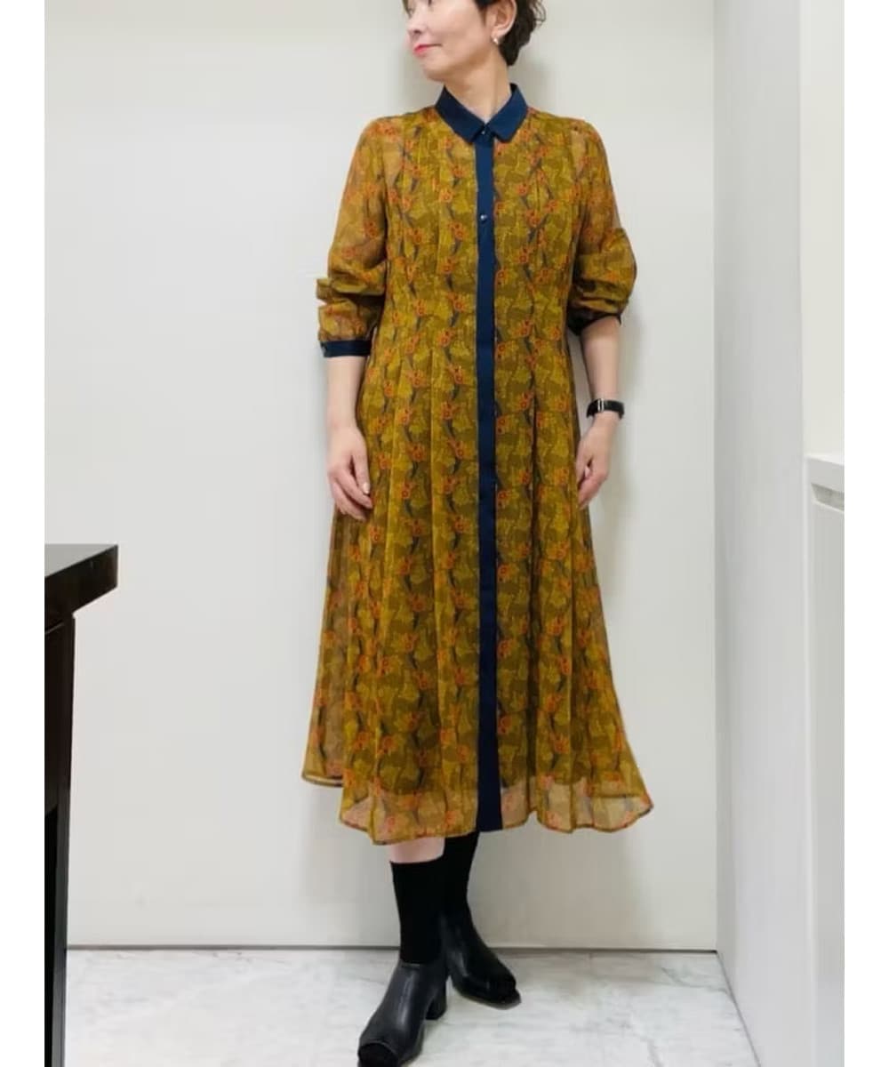 シンプルながら洗練された大人カジュアルを叶えるリーフプリントバンドカラーワンピースは、深みのあるグリーンカラーとアーティスティックなプリント柄が秋の装いにぴったり。