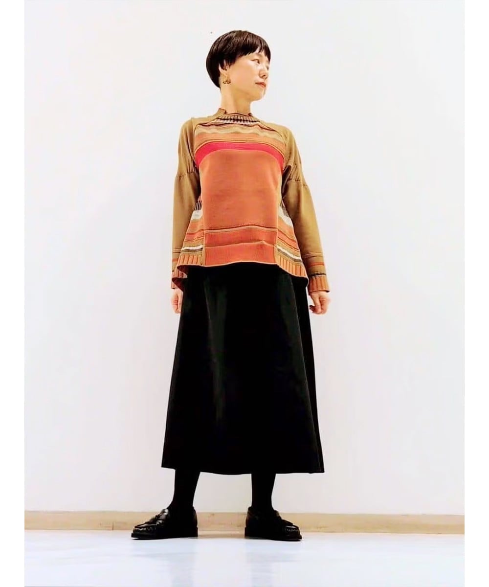 スカートはハリのあるタフタをメインに、サイドにはニットを使用。すっきりとしたシンプルなデザインです。ポケット部分はファスナー開閉でちょっとしたアクセントに。