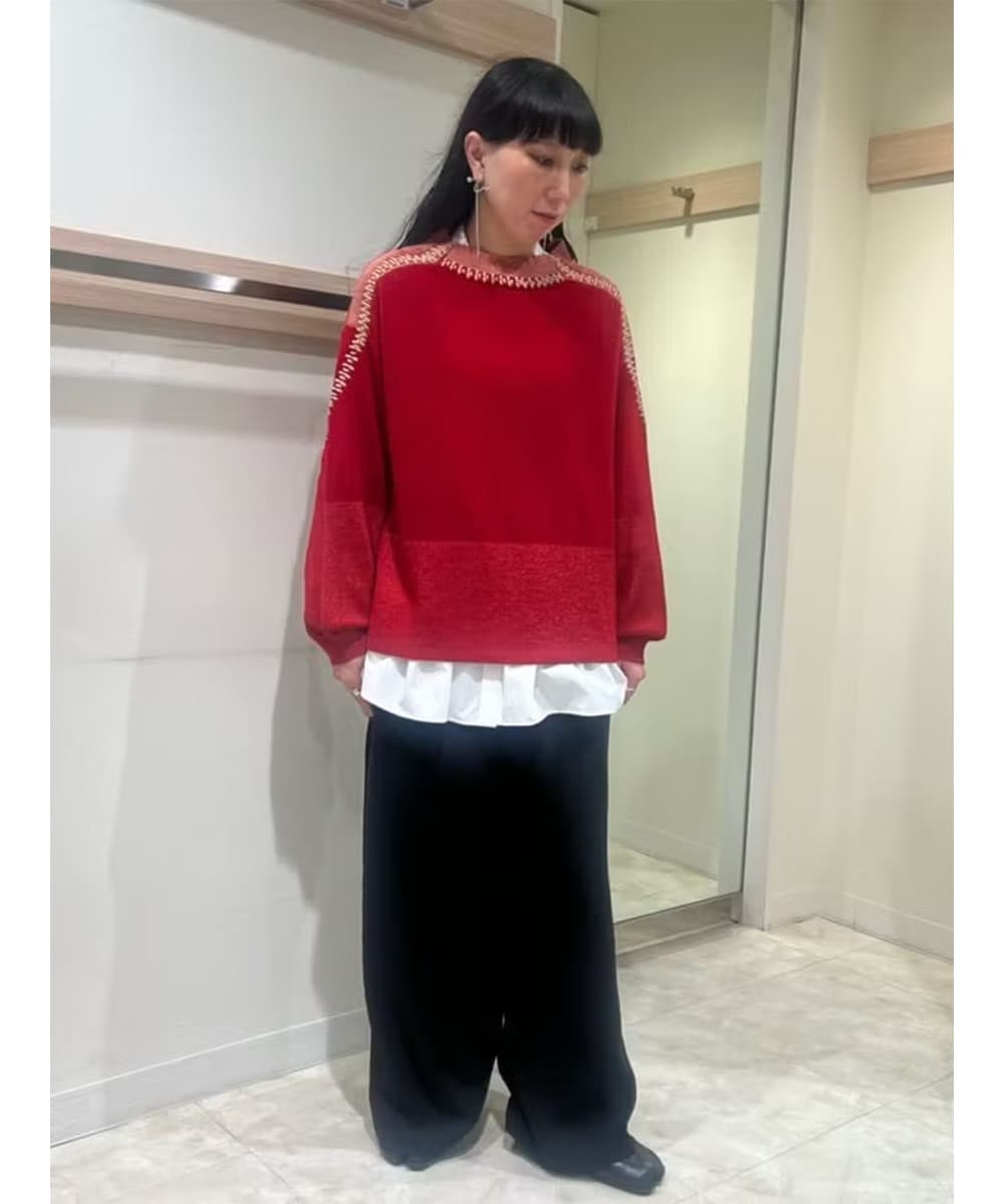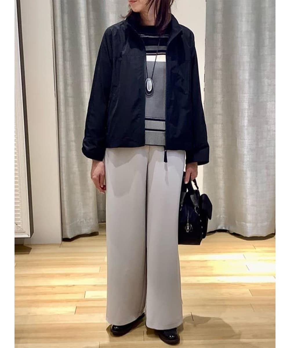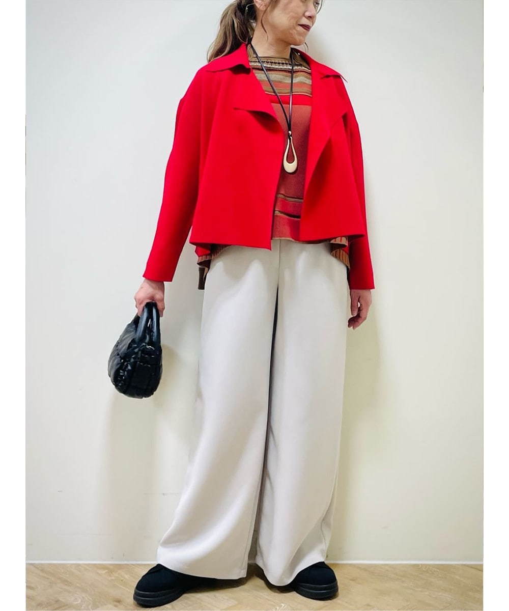 ベーシックなワイドパンツはスタイリングを上品に見せてくれる生地。