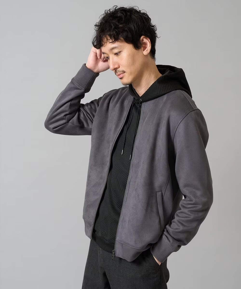 表面に起毛を施し本格的なスエードを目指したジャージー素材のリブブルゾン。やわらかな風合いとなめらかな手触りで、ジャージー素材の伸び感もあり動きやすいのがポイント。クリーンに着こなせる、素材感を活かしたシンプルでミニマルなデザインでカジュアルスタイルも大人な印象に。