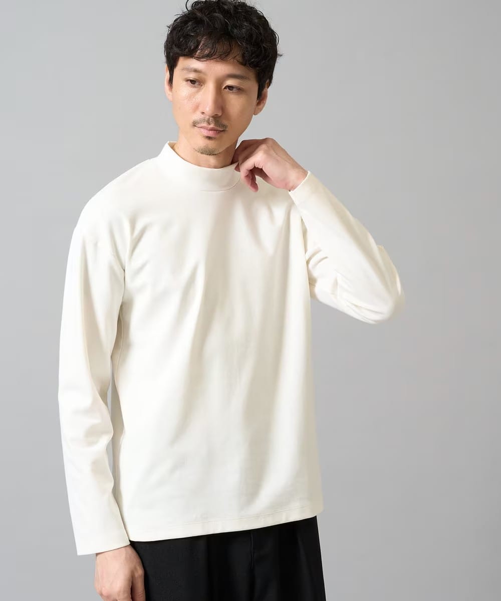 秋冬レイヤードスタイルのマストアイテム!きれいめ見えで伸縮性の高いストレッチポンチ素材を使用したシンプルなモックネックトップス。首元がタイトにならずにゆとりがあり快適な着心地と、クルーネックよりも上品さある印象を両立◎
