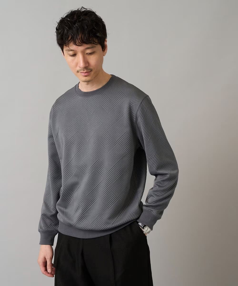 独特の表面感があるフクレジャカード素材で上品見えするキカ柄を表現したプルオーバー。一枚で着映えする大人なスウェット。フーディタイプよりもカジュアル感が少なく、どんなコーデにもすっと溶け込む汎用性の高い一着。
