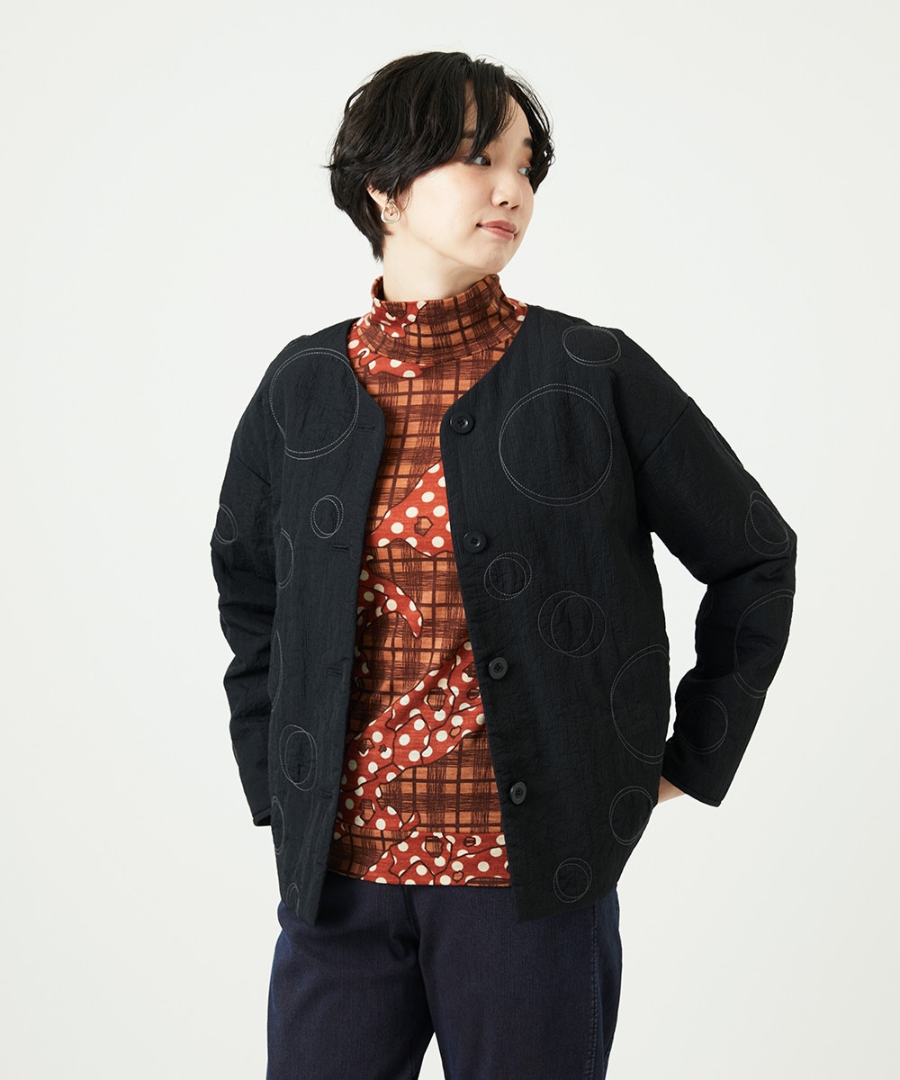 軽くて薄手の中綿キルトが使いやすいオリジナル刺繍のノーカラージャケット