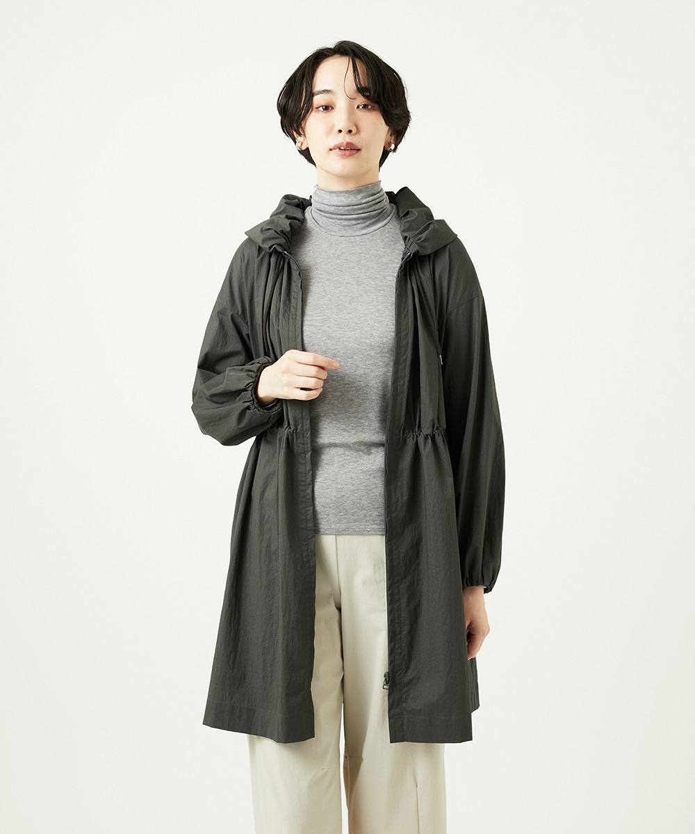 程よいハリがあり、シワ感を維持したり払って伸ばしたりと、風合いや光沢感を楽しめる素材。トレンドに左右されることなく長く着ていただけるデザインもポイントです。