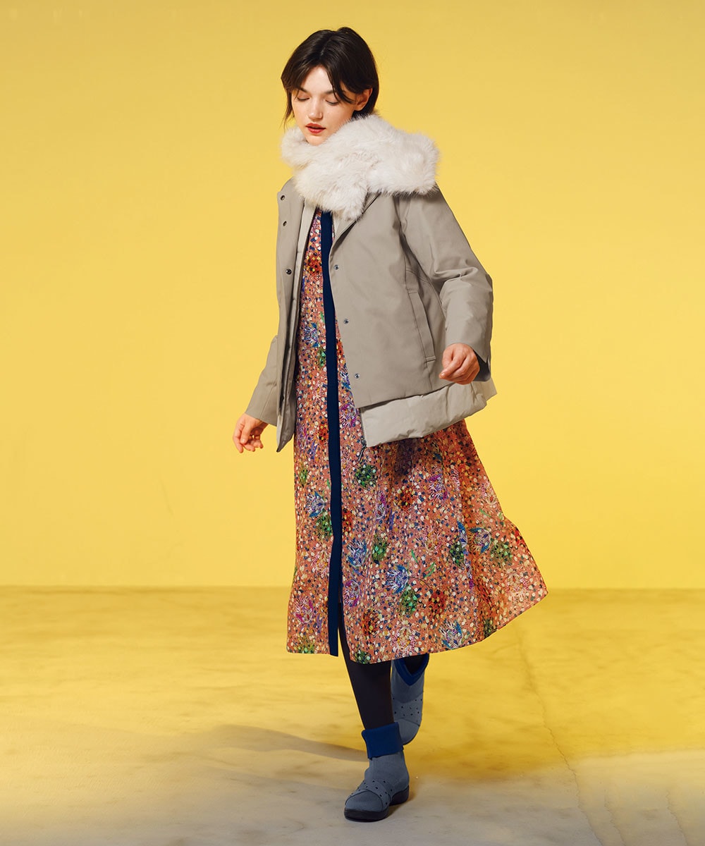 表情の異なる素材をレイヤード風に仕上げた、縦ラインを強調するすっきりしたスタンドカラーのダウンコートは、甘いムードのカラフルなアーティプリントがかわいいドレスにも好相性。 毛足長めのエコファーティペットをプラスして旬のスタイルに。