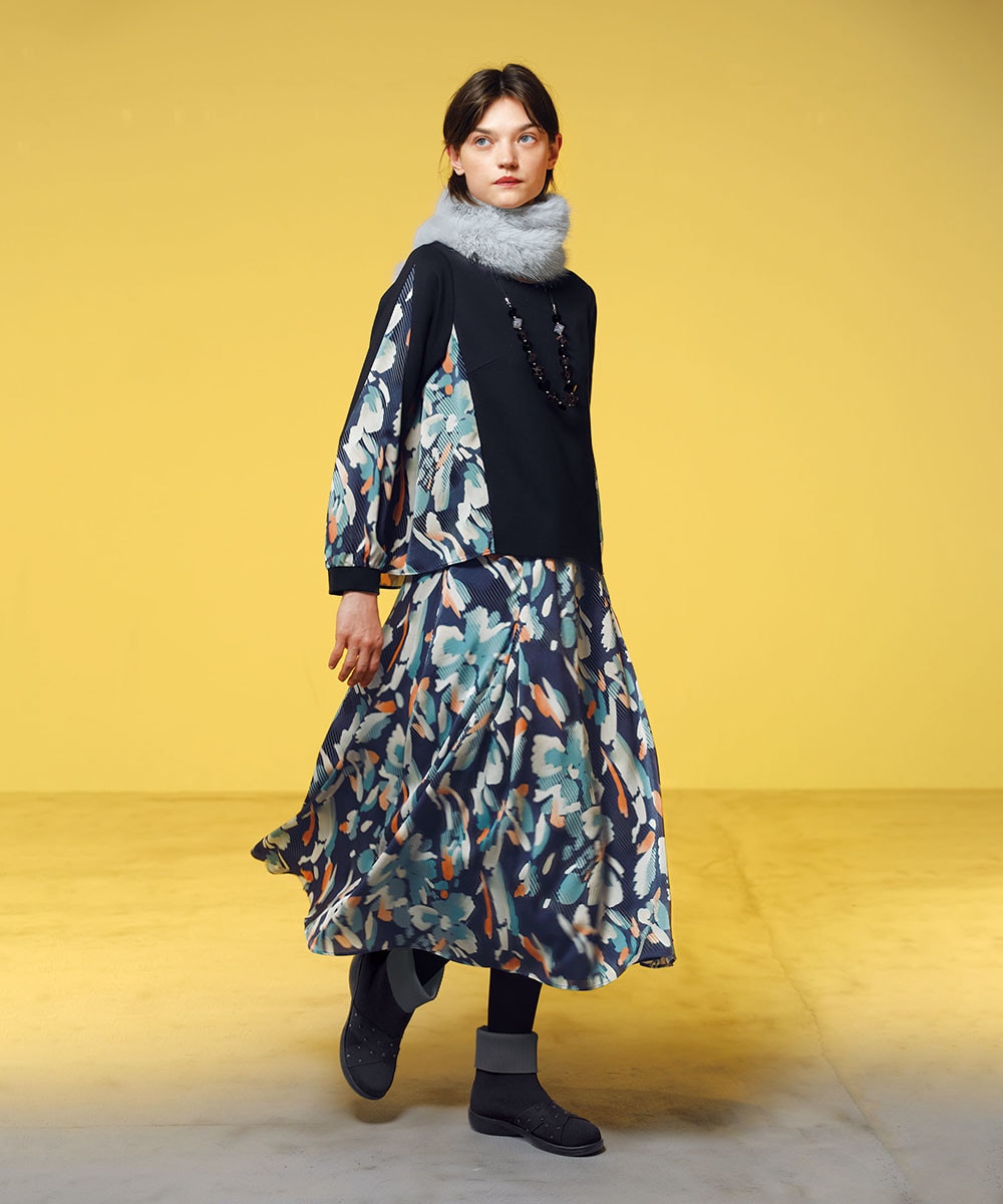 シックなカラーにコーラルを効かせたデジタルフラワーが、 華やかな印象の軽やかなセットアップスタイリング。 ジャージージョイントトップスの黒がフェミニンな中にも凛とした表情に。 動くたびにゆれるしなやかなプリントが冬の街に映える。