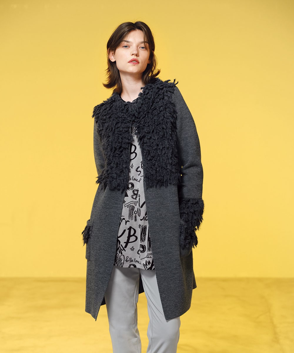 フリンジ風のフワモコボリュームがしゃれ感を生むロングカーデは、 すっきりした編地とのコントラストが魅力。 ポップなタイポグラフィーをのぞかせて、大人のカジュアルを楽しんで。