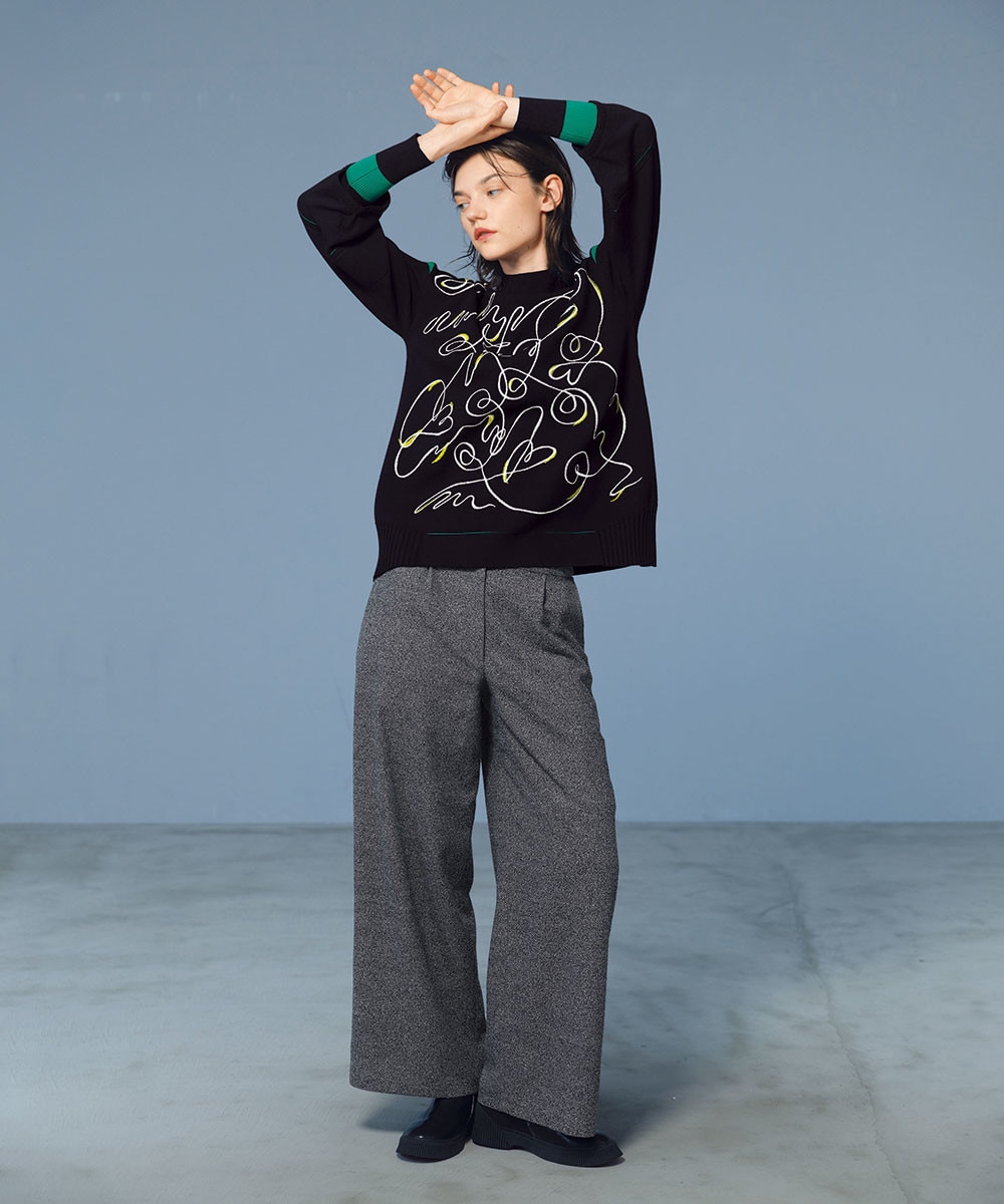 遊び心たっぷりに描いた曲線が楽しいニットは、 鮮やかなカラーをポイントに! 大人っぽいツイードのワイドパンツは、 カジュアルにもキレイ目にも自在に着まわせる優れもの。