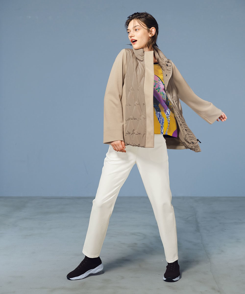 ジャージージョイントのライトダウンコートは、 圧着キルティングが可愛いアクセントに。 チアフルなカンガルーモチーフブルオーバーをのぞかせてホワイトパンツをあわせれば、ニュアンスのある大人のスポーティースタイルが完成。