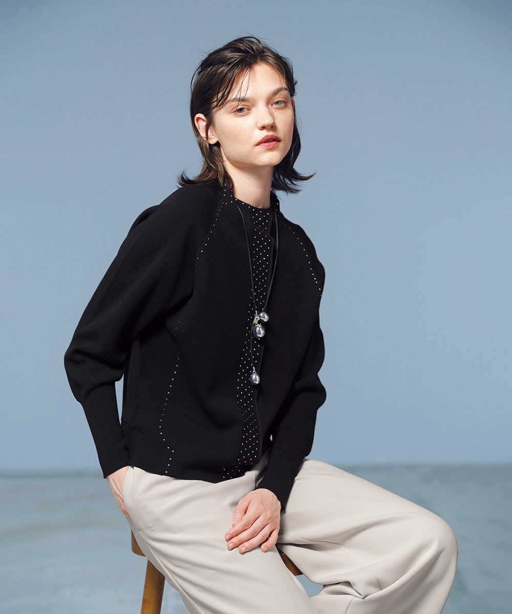 端正さが漂うブラックの辛口ニットカーディガンは、キラキラ光る小さなスクエアのメタルパーツが、エレガントなムードを引き立てる。