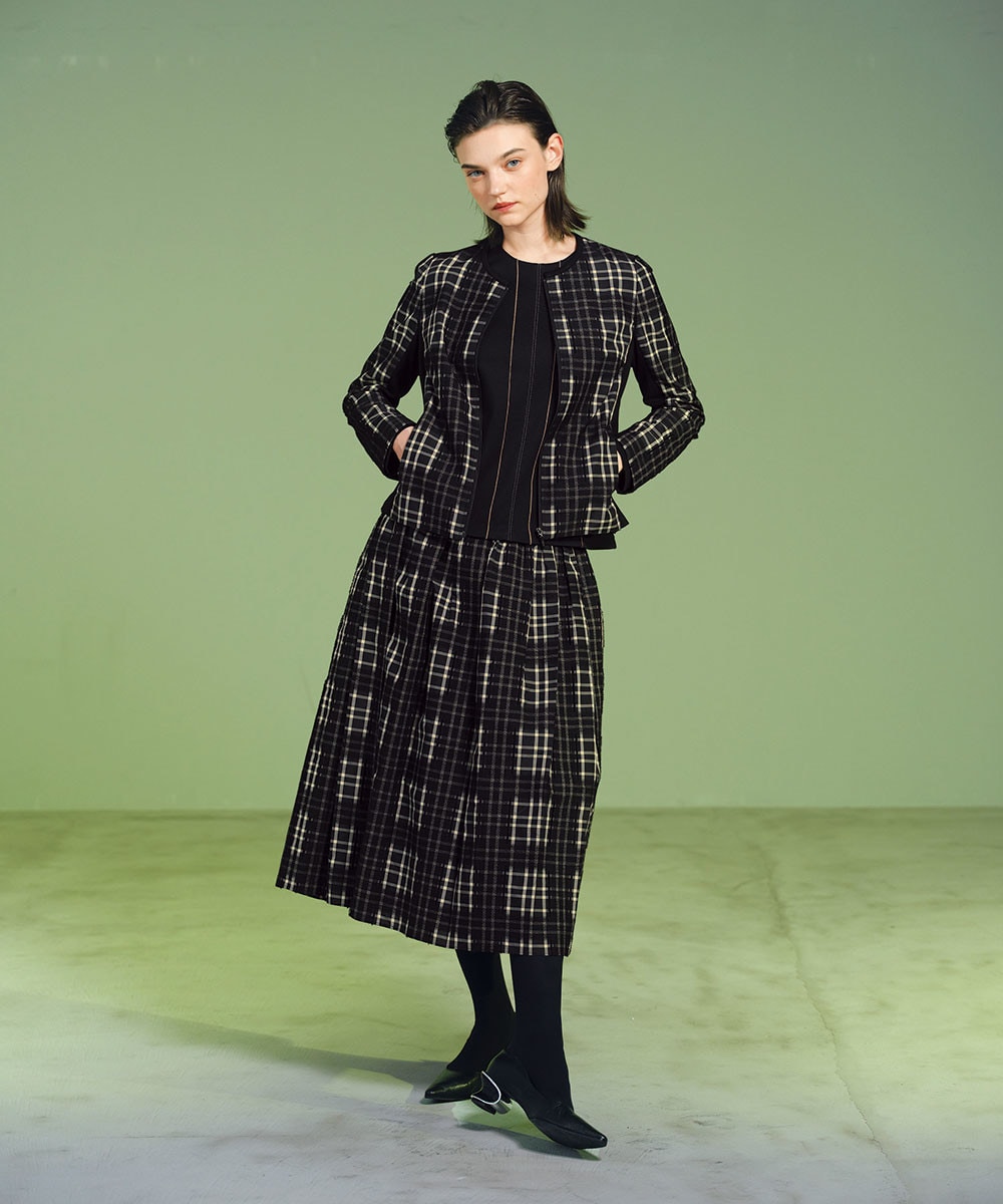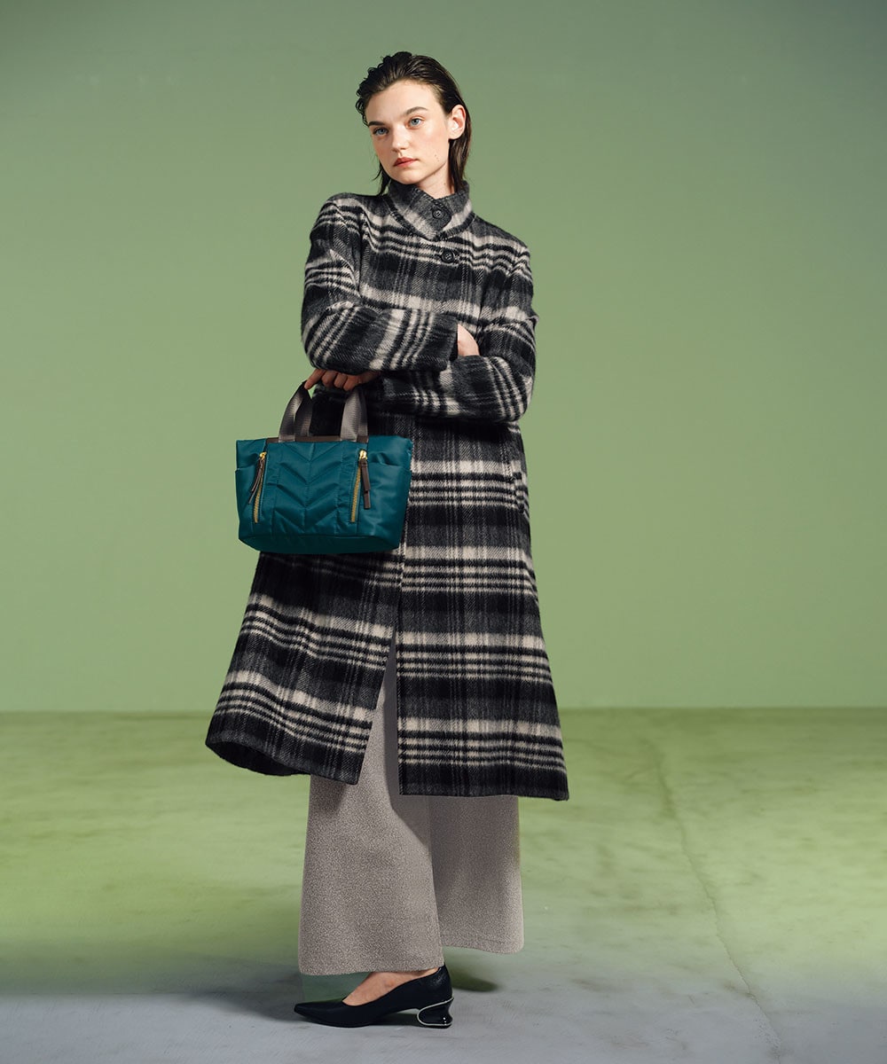 シンプルなチェスター型のロングコートは、 やさしいシャギーの大胆なチェック柄が新鮮。 丈感もボリュームも全てが大人にちょうどいい一着。 ツイードパンツをあわせて、気負いなく楽しめる大人の品格を漂わせて。