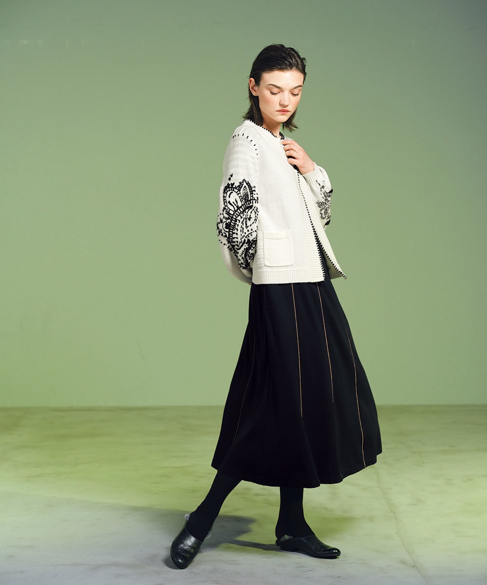 キャメルのラインが目を引くフィット&フレアードレスは、 ジャージーならではの着心地の良さがうれしい。アーティーなモノトーン刺繍が唯一無二の洒落感を生むカーディガンの柔らかなニュアンスに心惹かれて。