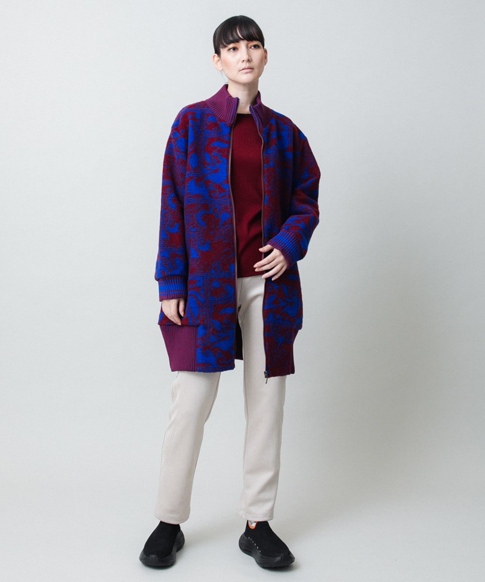 ペイズリーモチーフを幾何柄にアレンジしたオリジナルのジャカードニットコート。