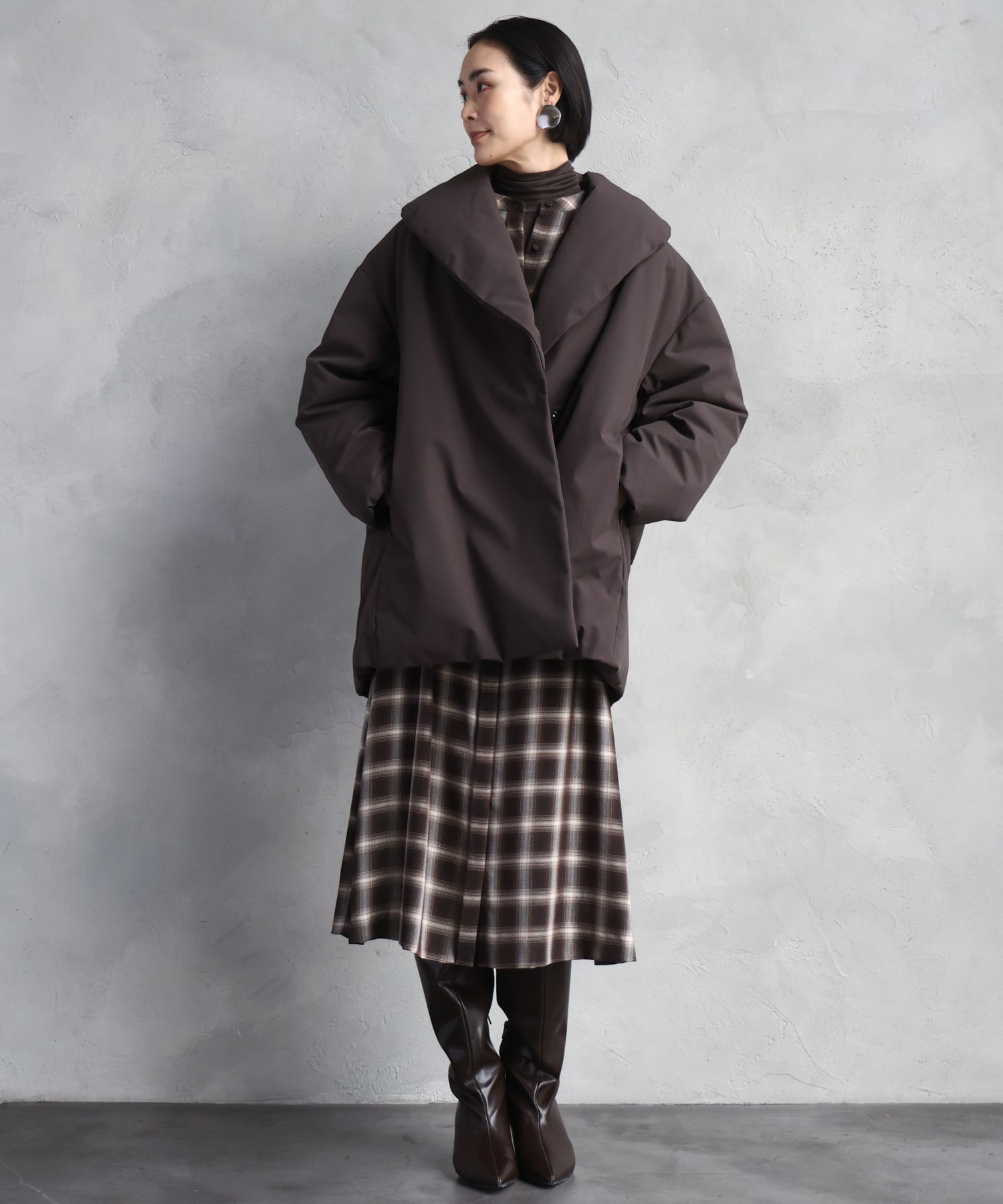 大きなショールカラーと立体的なコクーンシルエットが特徴のデザイン性の高いダウンコート。ミドル丈で合わせやすく、オーバーサイズながらパーツごとにダウン量を調整することで、すっきりとしたシルエットに仕上げています。前を開けたときに見えるさりげないメタルホックが上品なアクセントです。