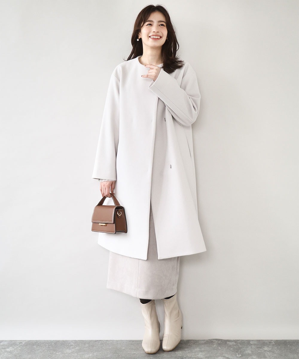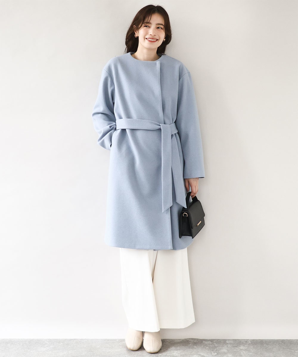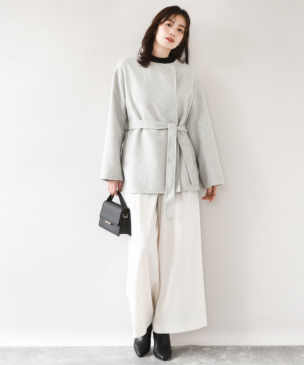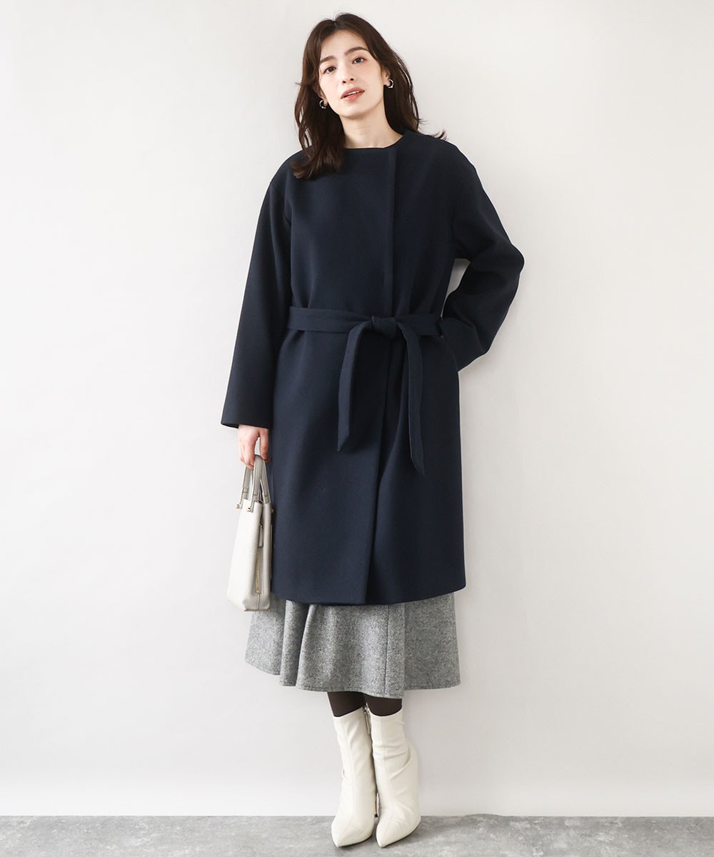 長く着こなせるリバー仕立てのノーカラーコート。程よくゆったりめのサイズ感で着心地良くすっきりきれいに着こなせるのがポイント。真冬の一歩手前に活躍してくれるやや軽めのアウターは意外と着用シーズンが長い優れもの。ヒップが隠れるミドル丈は合わせるコーディネートも選びません。共地のベルトでウエストマークをしたよりきれいめな着こなしもおすすめです。