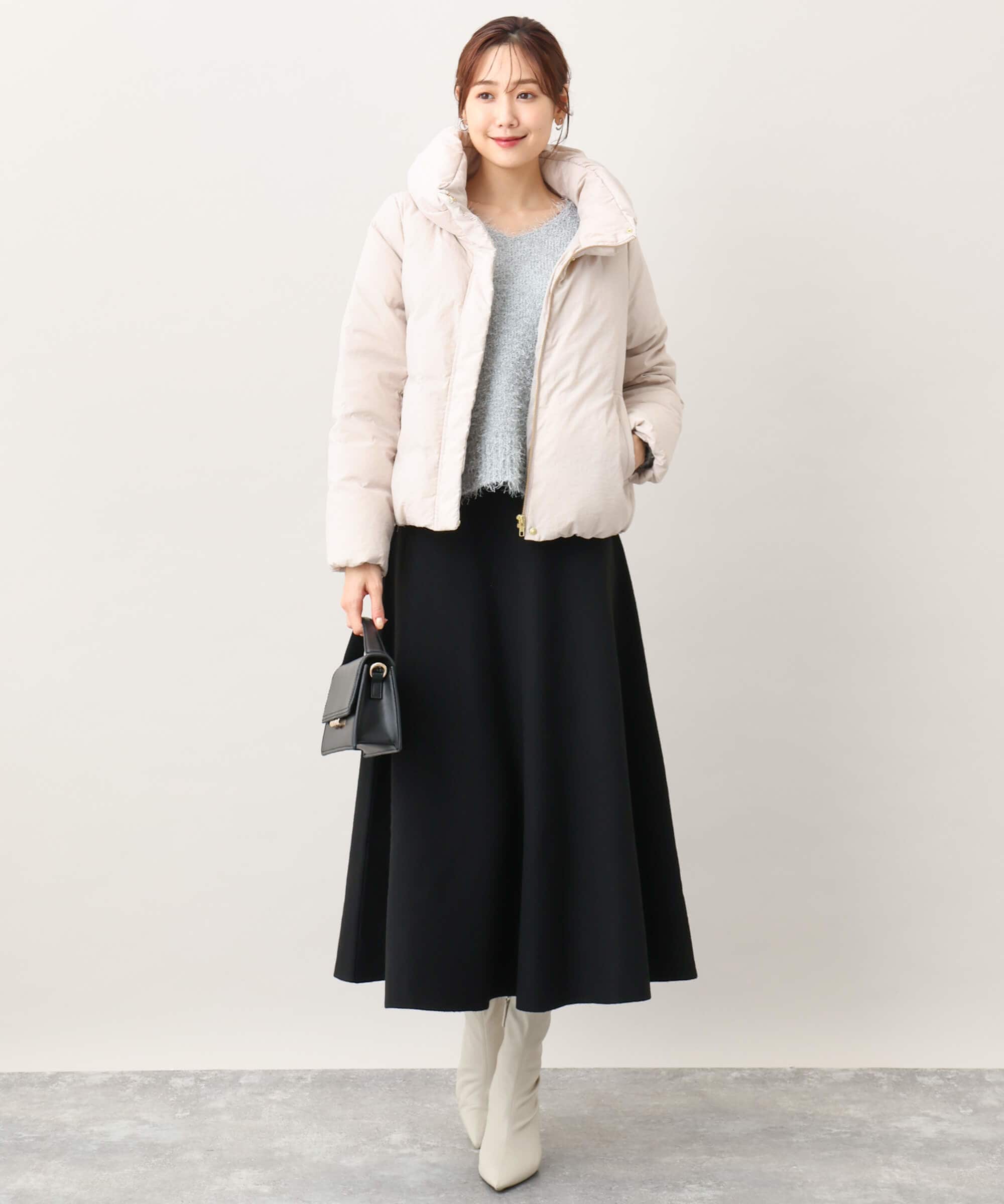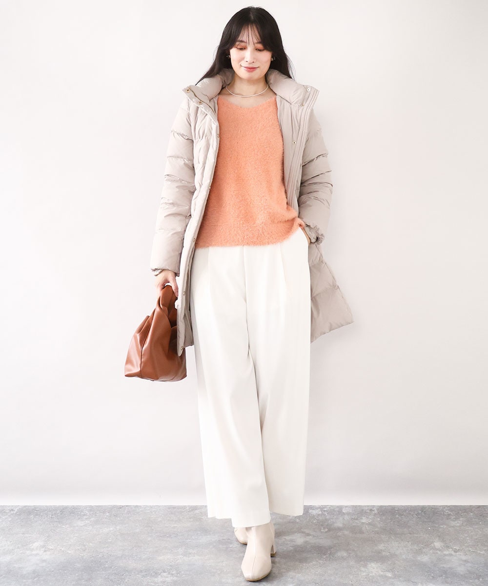 インナーのコーデを選ばないダウンは、迷ったときに頼りたい優秀アイテム。すっきりと着こなせるシルエットラインは着ぶくれ感も最小限に。淡い色合いは、冬のカラーニットとも好相性。