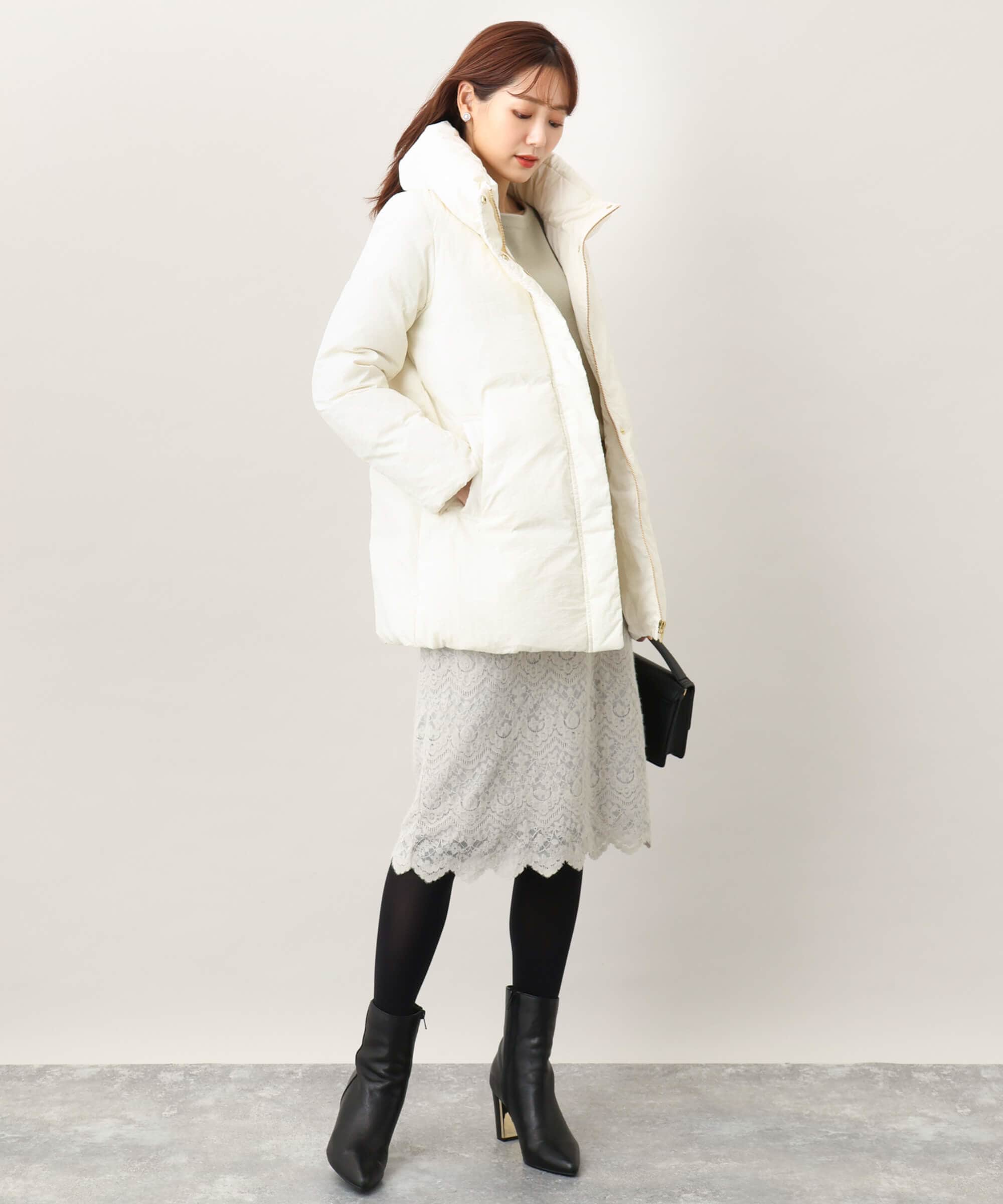 ヒップが隠れるミドル丈のダウンコート。衿部分は高さをしっかり出し、カジュアルになりすぎずきれいめにマッチしやすいデザインに仕上げました。ロングほど丈感が長くないので、パンツ、スカート、ワンピースとアイテム選ばずにさっと羽織りやすい。