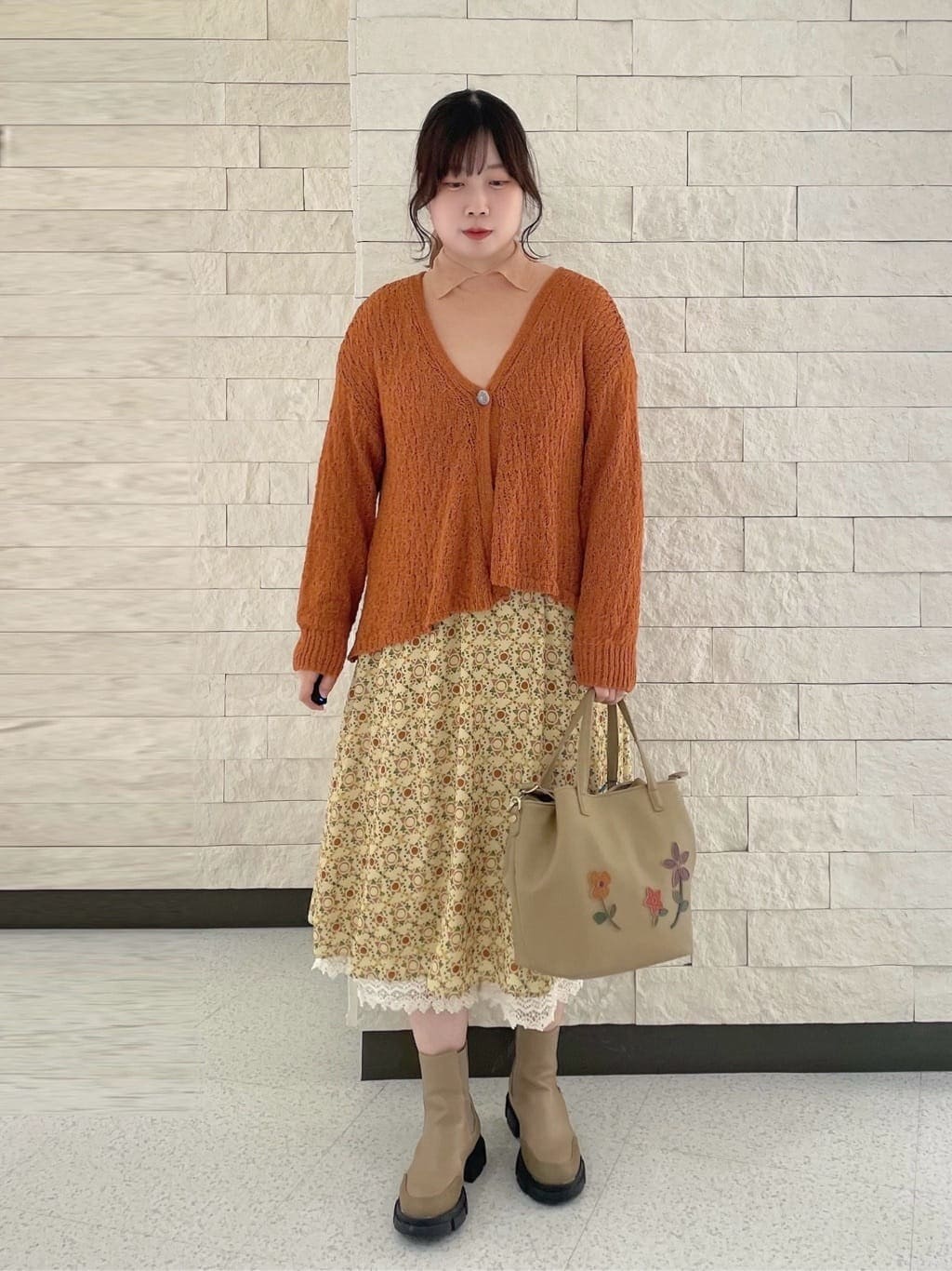 コーラル色のインナーにオレンジのカーディガンと黄色いスカートを合わせた、同系色コーデ!色味を合わせることで統一感が出て華やかさもUP◎
