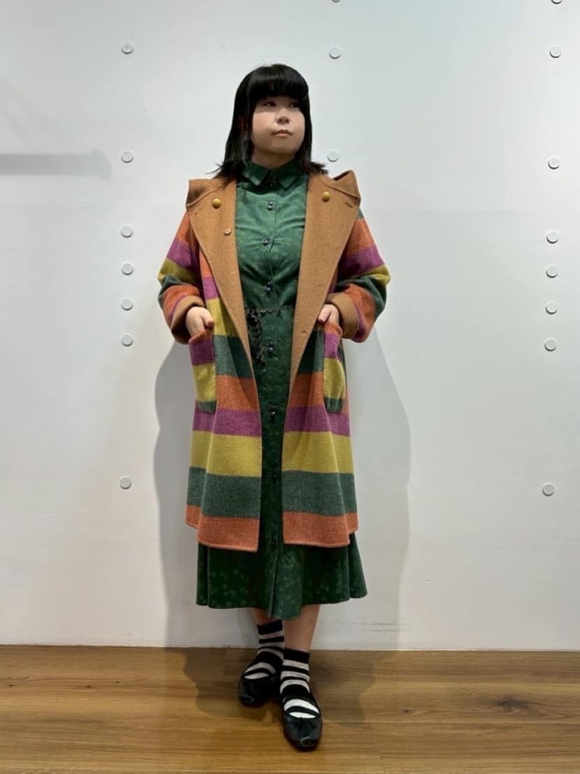 コーデュロイのワンピースにカラフルなコートを合わせた華やかなコーデ!