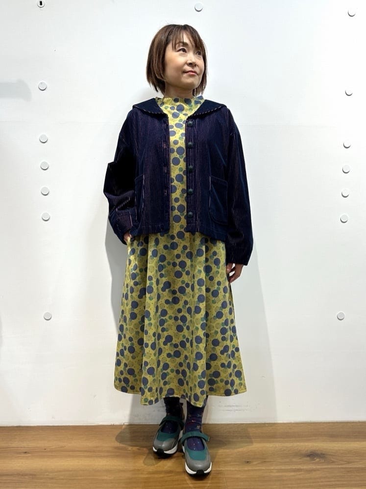 セーラーカラーのブラウスとドット柄のワンピースを合わせたレトロなコーデ!ブラウスはゆったりとしたサイズ感でジャケットとしてもお使いいただけます。カラフルなワンピースとシックなジャケットでワンランク上の大人コーデが完成◎
