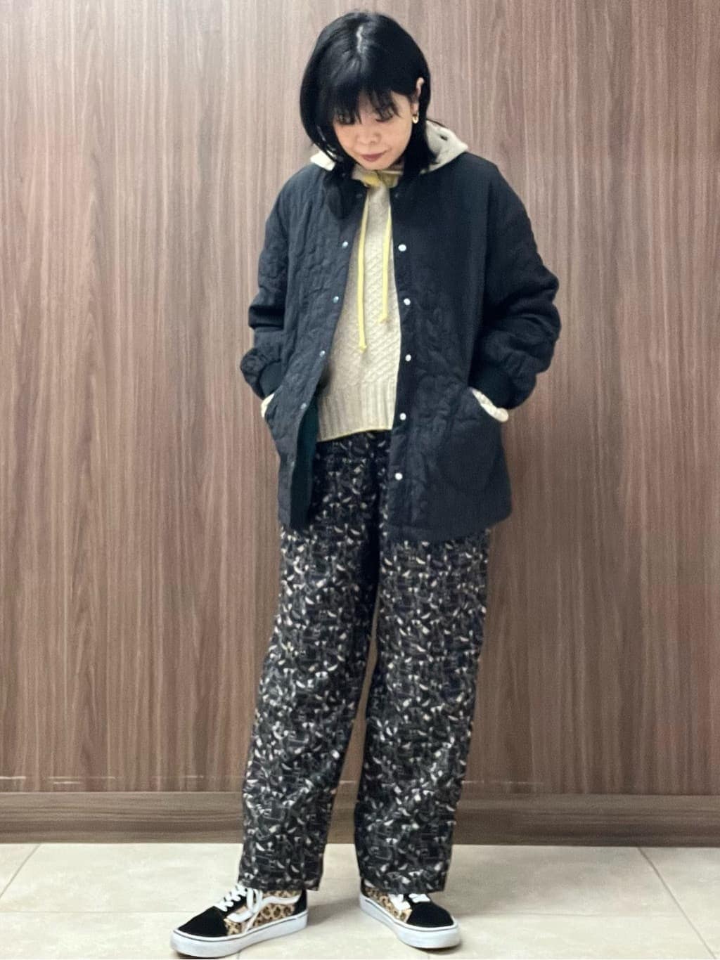 色味を統一し、柄モノでアクセントを取り入れたモノクロコーデ!アウターにはお花のステッチが入っていてかわいさUP◎柄物パンツもコーデの色味をシンプルにすることで派手になりすぎず、着やすくなります!
