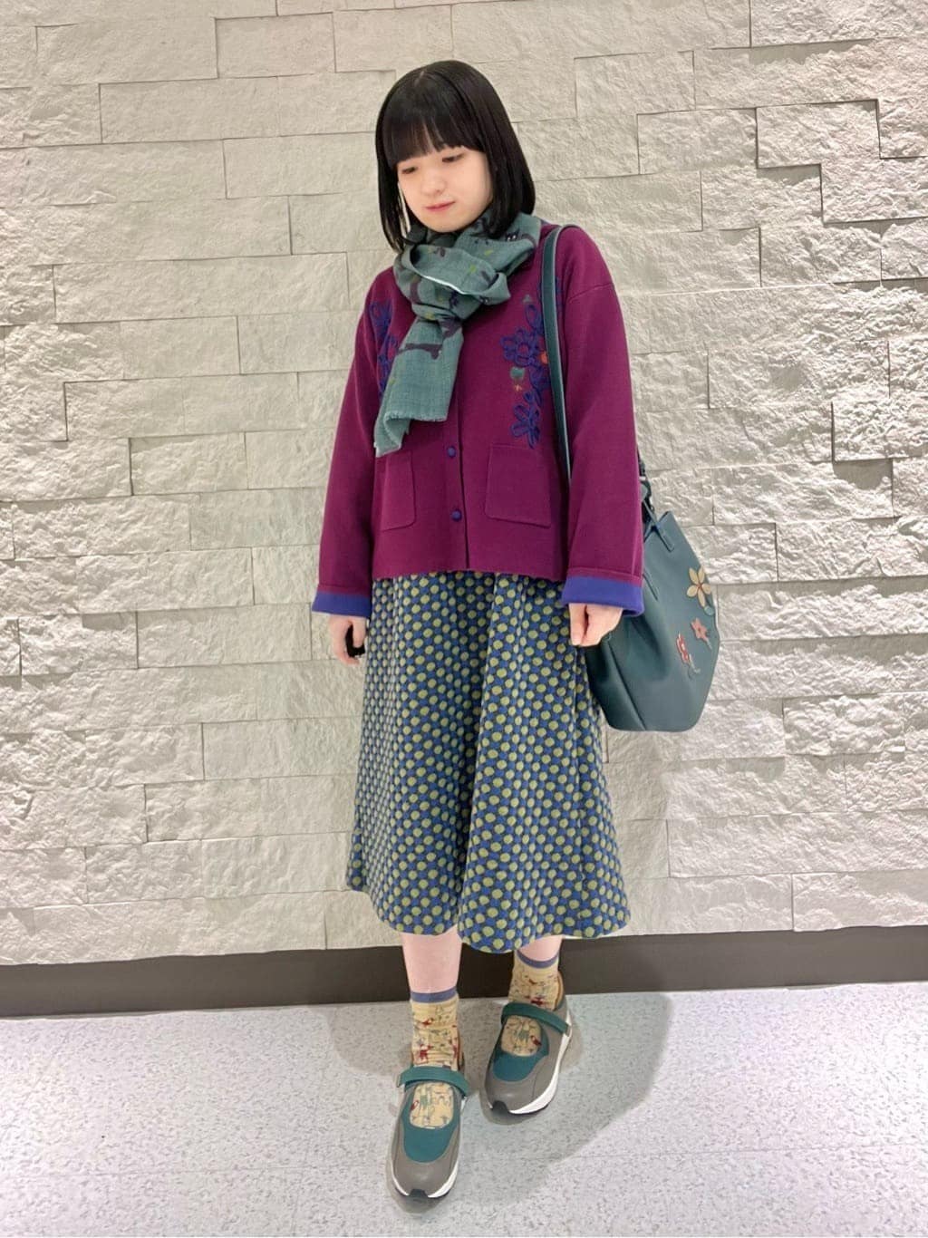 ドットのスカートと花柄の刺繍のカーディガンを合わせたレトロなコーデ!カーディガン以外の色を統一することで紫が差し色となり、よりオシャレな印象に。色のトーンを合わせるとバランスが取れ、シックな装いが完成します。