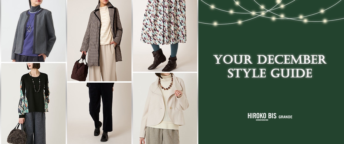 ラウンドカットのジャケットやデザイン性のあるスカートで、シックに女性らしさをプラス。