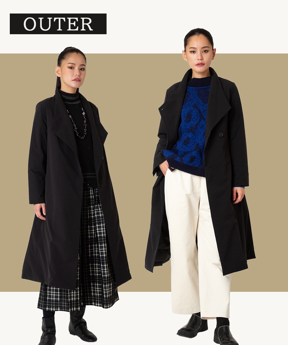 ウォーム感のあるロングコートは襟元のボタンの開け閉めで雰囲気の変化も楽しめます!