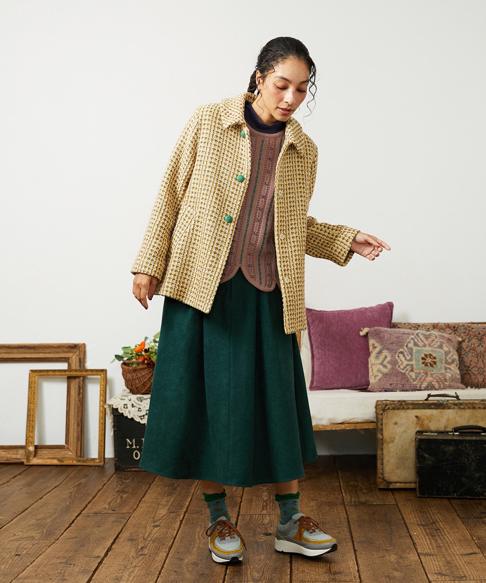華やかなカラーの主役アウター。ざっくり感が特徴のジャカード素材で、春先まで着用出来ます。4色の糸を使いホコモモラらしい春カラーに仕上げ、緑のボタンでアクセントをプラス◎シンプルながらも重厚感溢れるデザインで、日常使いはもちろん、お出かけなどの特別な日にもぴったりです。
